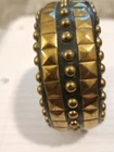 Elevate your style with this stunning handmade bangle featuring brass studs on a resin and wood cuff. The wide statement bracelet is perfect for adding a touch of ethnic flair to your outfit. The round shape and pull on closure make it easy and comfortable to wear for any occasion. This unique piece of jewelry is a must-have for any fashion-forward woman. The brass and brown color combination is versatile and will complement any outfit. The cuff and bangle style makes it a perfect accessory for both casual and formal occasions. Add this beautiful piece to your collection today!