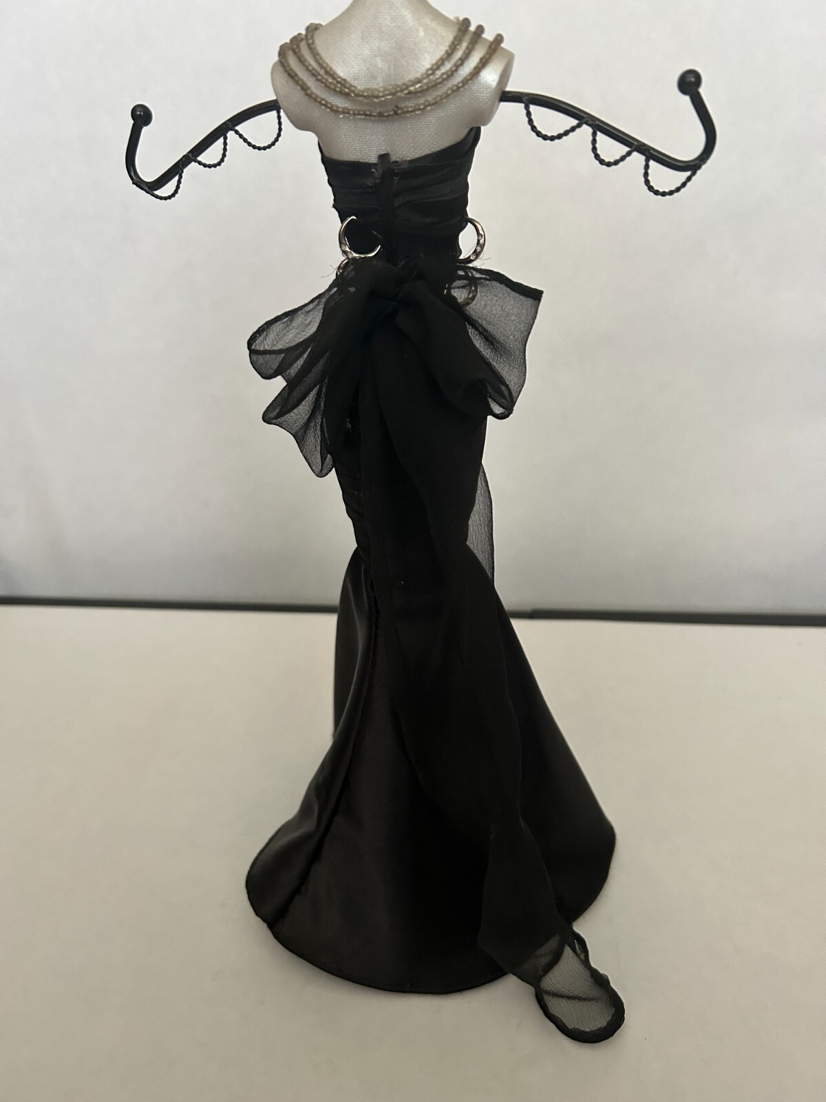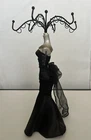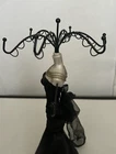 Necklace, Bracelet, and Earring Jewelry Stand/Necklace Holder Inspired by Breakfast at Tiffany's. Five holders at the top, two from the side. There are four silver clasps built into the back sides of the dress - for extra storage. Height: 15 1/2", Circumference at top: 7", Pedestal circumference: 3 5/8"