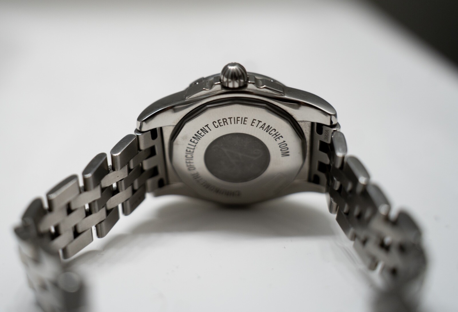 Elevate your timepiece collection with the Breitling Galactic 36 Shamrock Olive Green 'P. Sheeran' Dublin Diamond A37330. A statement of sophistication and functionality, this watch features a stunning olive green dial complemented by diamond markers, set within a durable stainless steel case and bracelet. The self-winding mechanical movement ensures precise timekeeping, while the bracelet strap provides a secure and comfortable fit.Designed for the discerning individual, the watch boasts a 36mm case size, making it suitable for both casual and formal occasions. It is equipped with luminous hands and indexes for visibility in the dark, water-resistant up to 100 meters, and displays the time with a center seconds, minute, and hour hand. Complete with its original box and papers, this Breitling Galactic is a luxurious addition to any ensemble.