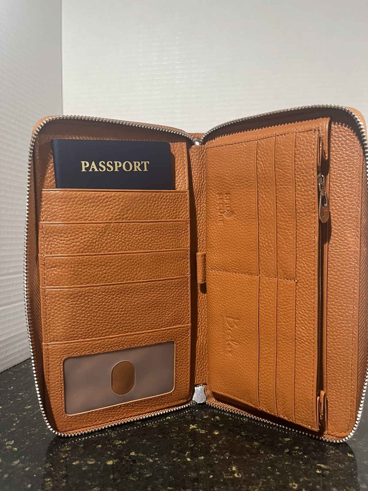 The Brelox Travel RFID Passport Holder Wallet is a genuine leather organizer designed to keep your passport, ID, and other travel documents safe and secure. The wallet comes in a stylish brown color and features RFID protection to prevent identity theft. With its compact size, it is perfect for travel and can easily fit in your pocket or purse. This is new without a box.