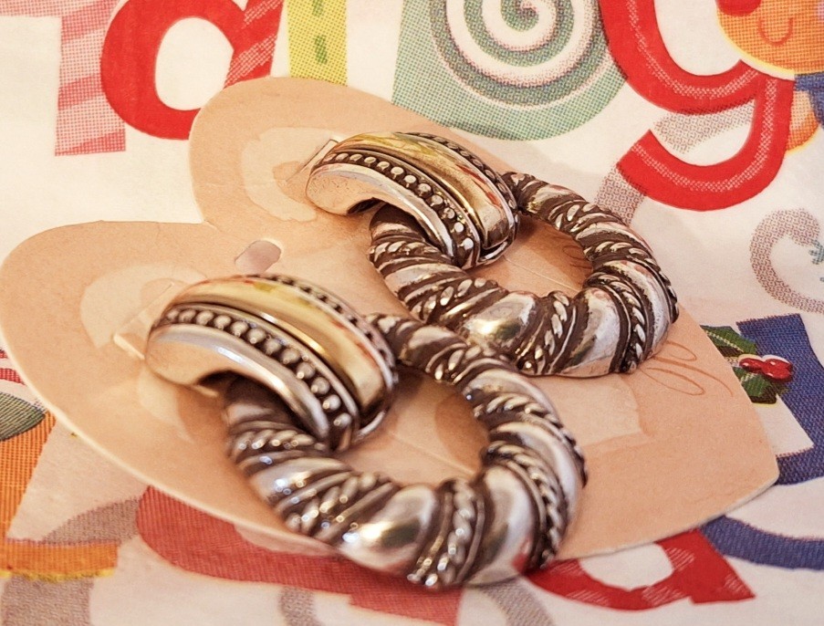 ***Refurbished With New Posts That Don't Show When Wearing ~ Slightly Brassy gold tone center*** Brighton, Beautiful 2-Tone "Bordeaux" Doorknocker Style Earrings ~ Retired Style! These earrings measure 1 1/4" long, 1 1/4" wide and 1/8" thick with a gold tone stripe down the center and silver braided design all around. The posts have been replaced with new posts, secured with Gorilla Glue and checked before shipping.They are thin and very lightweight and have gentle movement with the signature Brighton hearts and "B" on the backs and disc backings. Can be worn with both your gold or silver jewelry! **Any dark marks or shadows down the center gold tone are from the camera** They are new and are ready for gift giving. (NO HEART CARD OR TIN INCLUDED) Better in person, photo doesn't do them justice. Please check out my additional Brighton auction items and my handmade anklets with genuine Swarovski crystals and semi-precious gemstones in an array of colors! I accept Paypal only and I do combine shipping. Buy with confidence, check my feedback for assurance. I want all of my customers to be 100% SATISFIED and HAPPY with their purchase, so if for any reason you are not, PLEASE CONTACT ME FIRST before leaving negative feedback.. Shipping fees reflect postage, paper, ink, tape, bubble mailer, bubble wrap and gas to the post office. * Please read return policy before bidding.