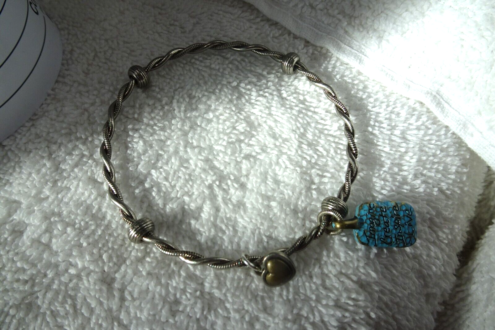 The Brighton bangle bracelet is a charming piece of fashion jewelry in a beautiful blue color. It features an inspirational theme with the words "Imagine, Create, Inspire, Live" engraved on the charms. The bracelet is made with silver plated metal and has a stylish charm style, adding a touch of elegance to any outfit. Perfect for those looking for a meaningful accessory to wear or to give as a thoughtful gift.
