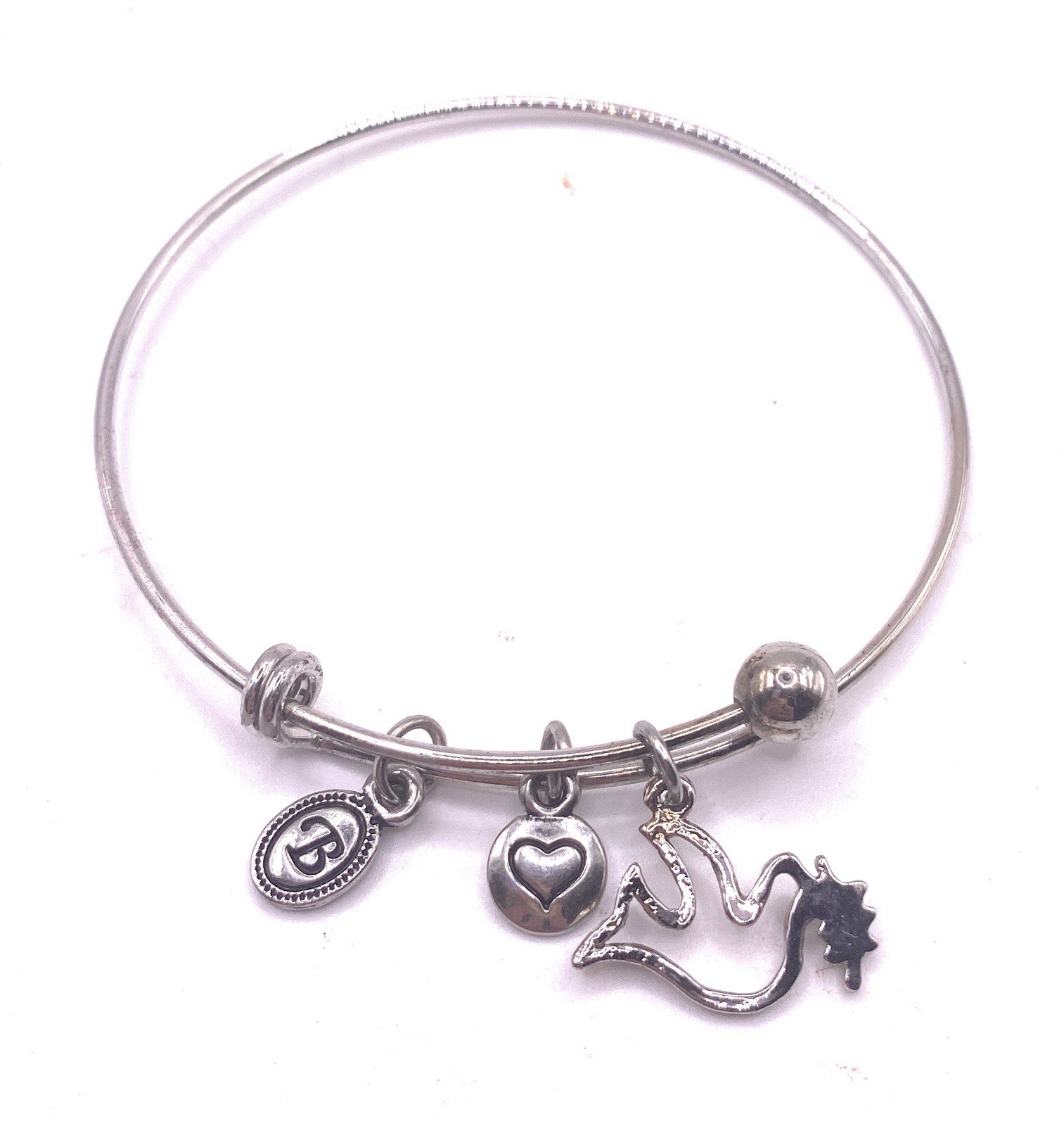The Brighton Bangle with Dove and Olive Branch heart charm is a stylish and meaningful bracelet designed by the brand Brighton. The bangle features a dove with olive branch shape pendant with a heart-shaped charm all set in a beautiful silver color. This bracelet is a perfect accessory to add a touch of faith and elegance to any outfit, making it a lovely choice for those looking for a meaningful piece of jewelry. Track Page Views With Auctiva's Counter