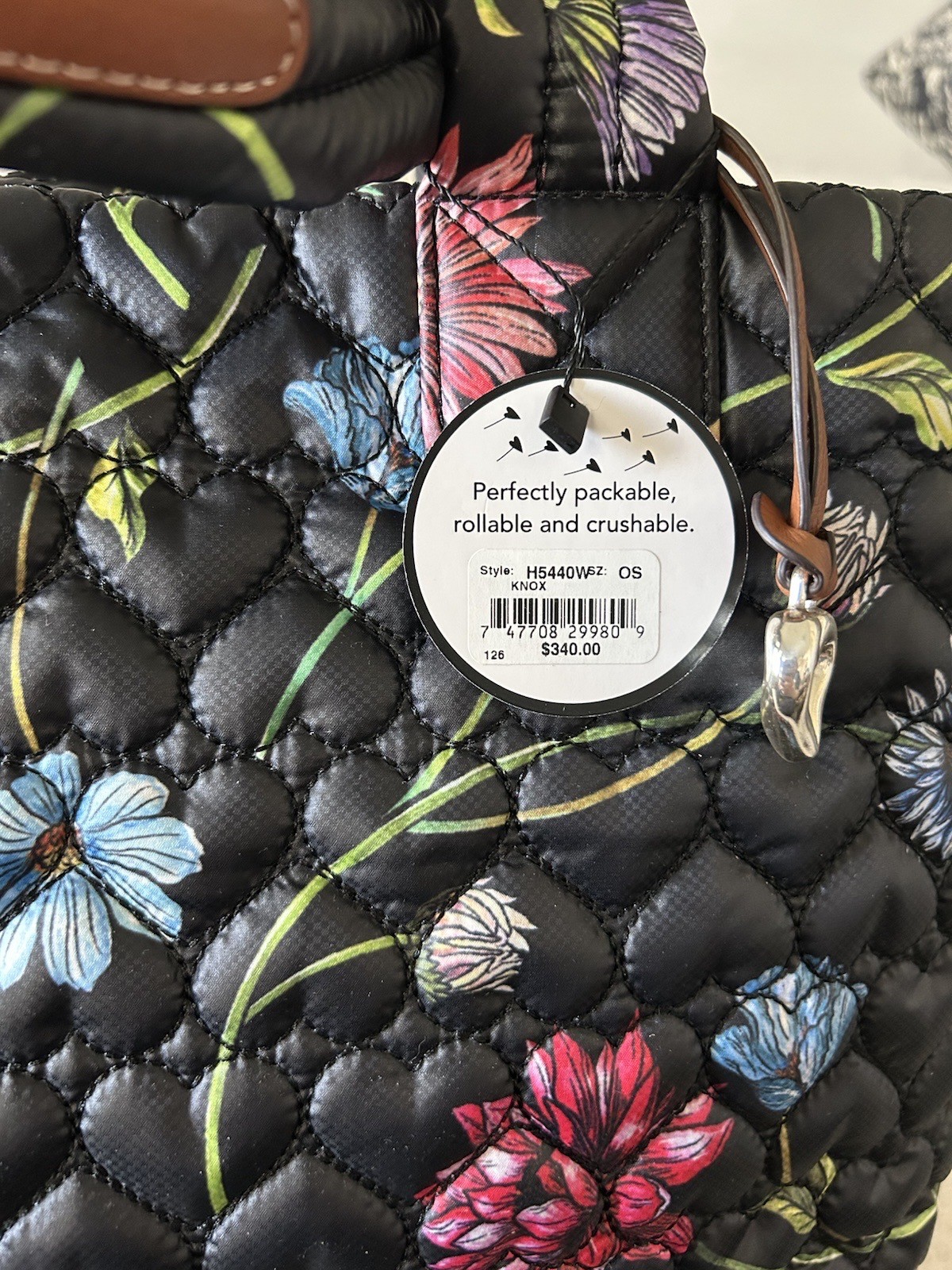 Knox Extra Large Tote In a light-as-air featherweight quilted nylon, this EXTRA LARGE and oh-so-roomy tote is ideal for travel. An injection-molded top zipper ensures it will never snag and the bag can be folded and packed into one of its TWO included pouches! Includes a key holder too. So ideal for travel. smoke and pet free home Width: 22" Height: 14 3/4" Depth: 9" Strap: 10" Top Closure: Ziptop Interior Pockets: 4 Exterior Material: Parachute nylon Interior Lining: Nylon Features: 2 Detachable Pouches/Key Holder