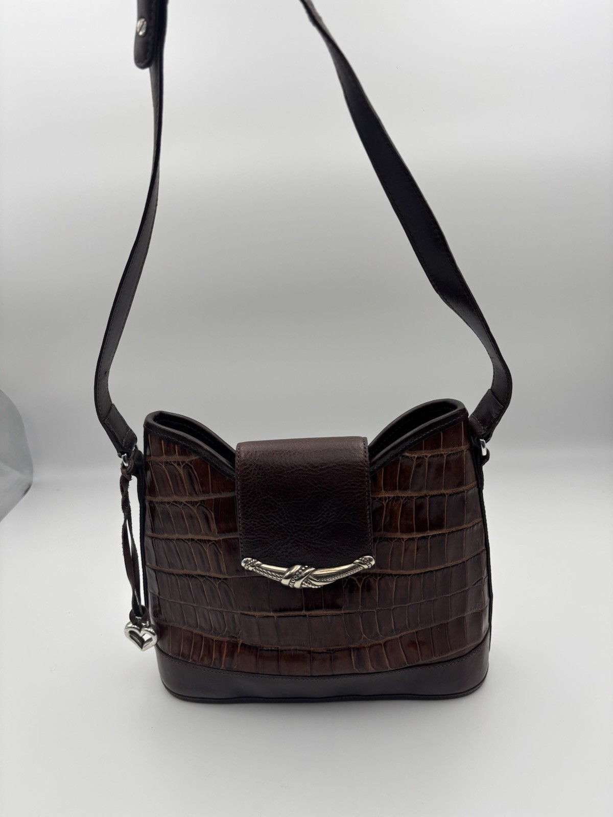 The Brighton Leather Shoulder Bag in Tan Brown Croc Embossed with an Adjustable Strap is a vintage-inspired accessory perfect for women looking to add a retro touch to their style. Made of leather with a solid pattern, this medium-sized bucket bag features a plaid lining, making it a stylish yet practical choice for everyday use. The classic design and quality craftsmanship of the Brighton brand make this bag a timeless and versatile addition to any wardrobe.