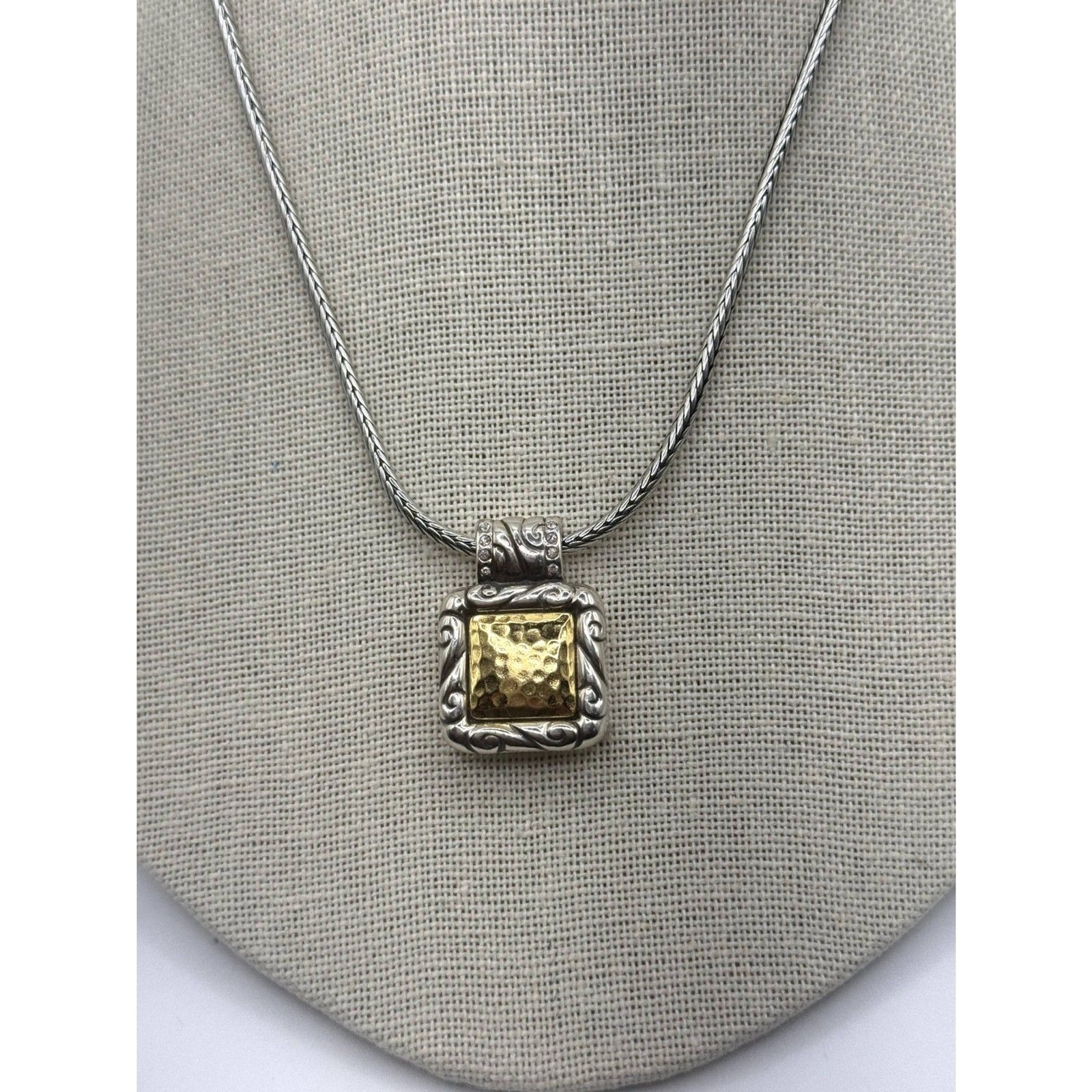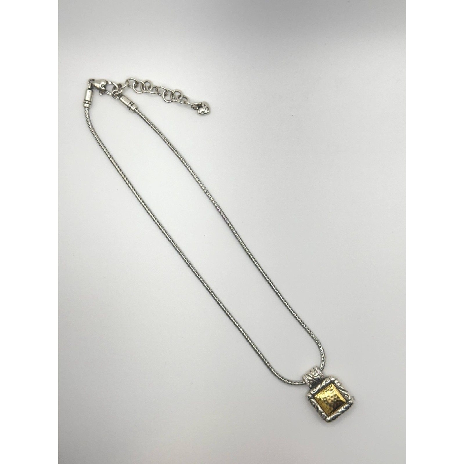 Elevate your jewelry collection with this stunning Brighton Regina Silver Gold Pendant Necklace. Crafted with a beautiful combination of silver and gold, this statement piece is perfect for adding a touch of elegance to any outfit. The pendant features a unique design that is sure to catch the eye, while the necklace offers a comfortable fit that will allow you to wear it all day long. This necklace is perfect for those who love to make a statement with their jewelry. With its beautiful color combination and unique design, it is sure to become a favorite in your collection. Whether you're dressing up for a special occasion or just adding some sparkle to your everyday look, this Brighton Regina Silver Gold Pendant Necklace is the perfect choice. Color: Silver-Gold Collection: Regina Closure: Lobster Claw Length: 16" - 18" Adjustable Pendant Drop: 1" Finish: Silver plated, Brushed gold, Hammered