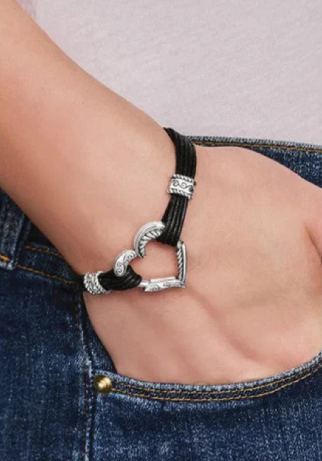 Like new. The Brighton Silver Heart Bracelet with Black Cord is a stylish and adjustable piece of jewelry. Made of silver plate with a lobster closure, this bracelet features a heart-shaped charm in black on a 7-inch cord bracelet. The adjustable design allows for a comfortable fit, making it a versatile accessory to be worn alone or stacked. The high-quality craftsmanship from Brighton adds a touch of elegance to any outfit, making it a perfect addition to any jewelry collection.