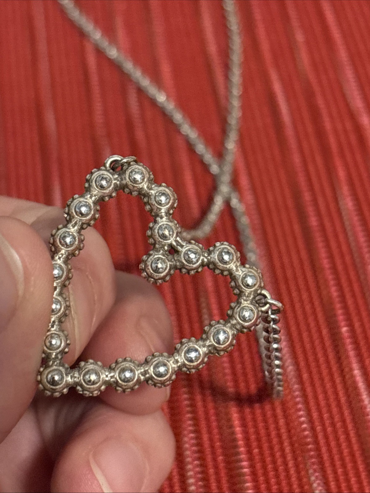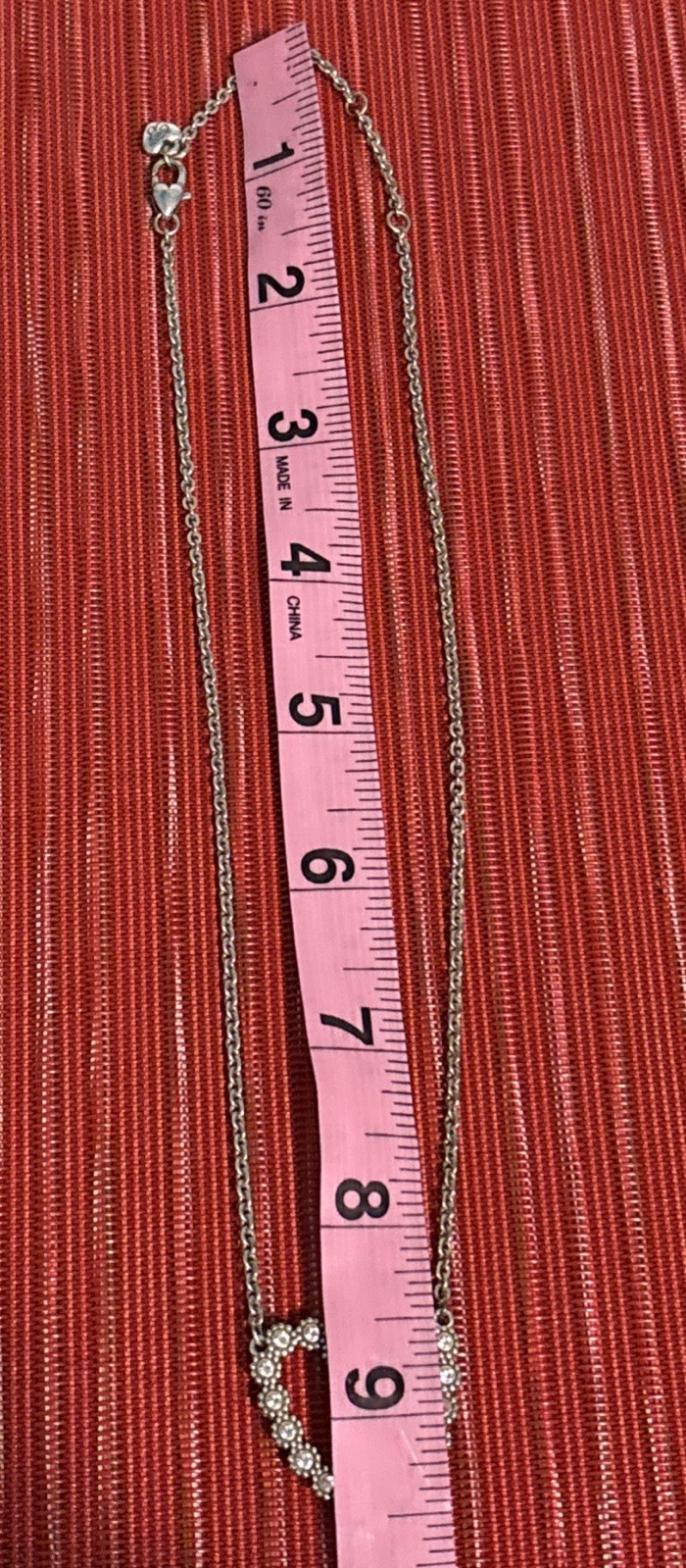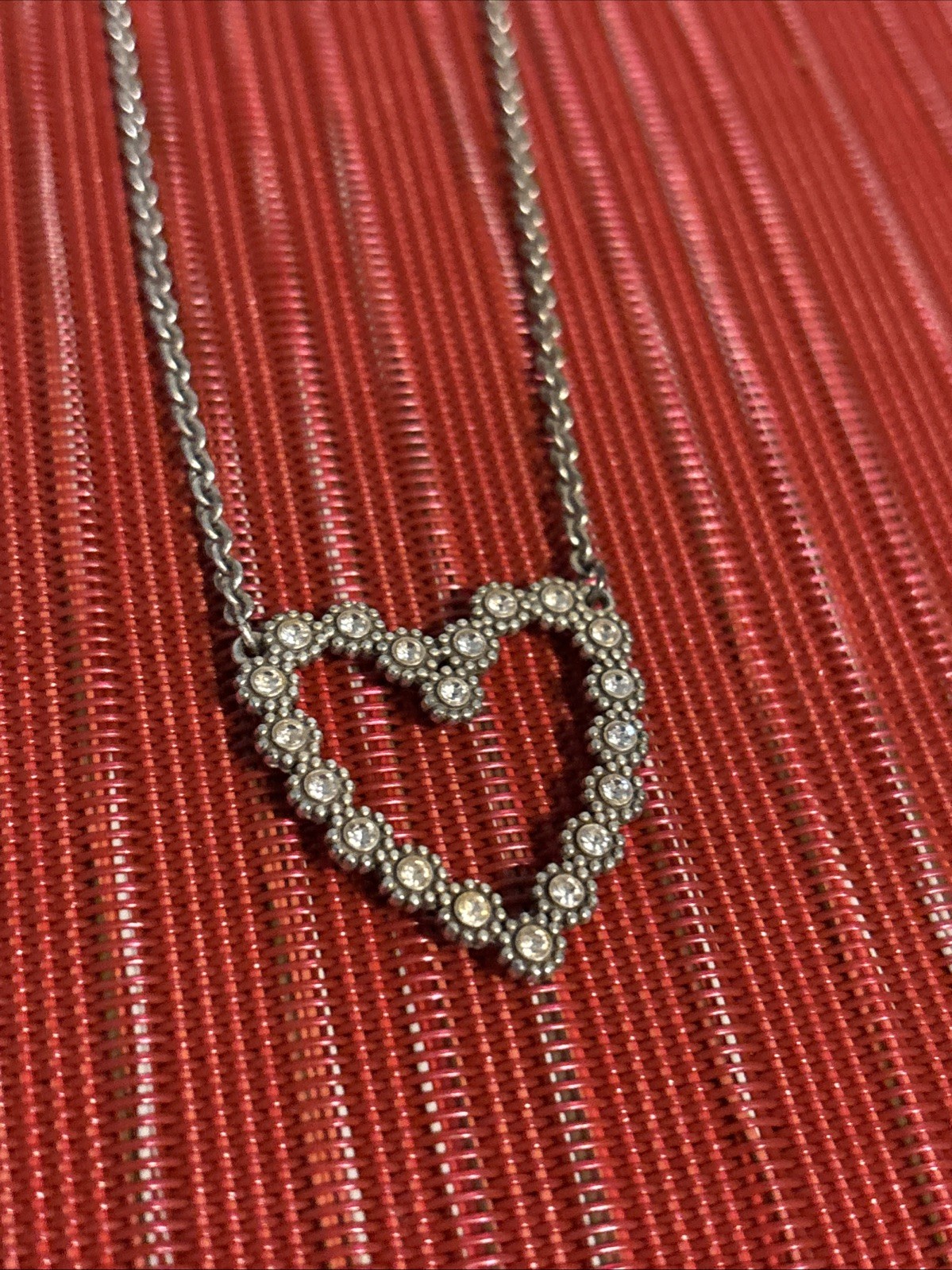 The Necklace Brighton Twinkle Floating Heart Designed by Lisa Spayd-Sendre is a charming piece of jewelry featuring a silver chain with a floating heart pendant. The heart-shaped pendant is adorned with a white/colorless crystal, adding a touch of sparkle to the design. The necklace has a lobster closure and is total 18 inches in length, making it a perfect accessory to represent love in a stylish and elegant way. Perfect for everyday wear or special occasions, this necklace is a lovely addition to any jewelry collection. See photos for details and approximate measurements