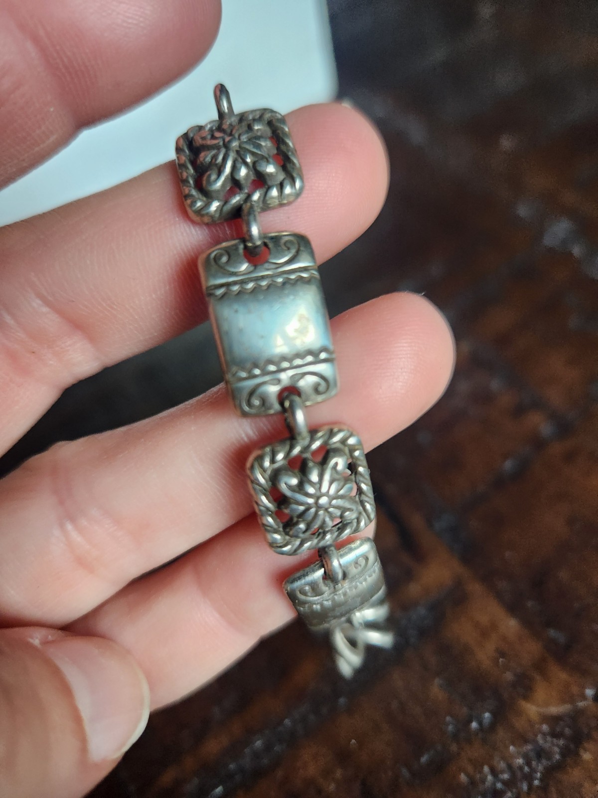 The Brighton "Vanity" Silver Plated Square Link Toggle Bracelet is a vintage and retired piece that exudes elegance and charm. This 7.5" bracelet features a square-shaped design and a toggle closure, perfect for special occasions such as engagements, weddings, anniversaries, and birthdays. Made of silver plated material, this bracelet is nickel-free and signed by Brighton, adding to its authenticity and quality. Its intricate design and geometric pattern make it a versatile accessory that can complement a variety of styles, from retro to luxurious. Perfect for adding a touch of vintage flair to any outfit.