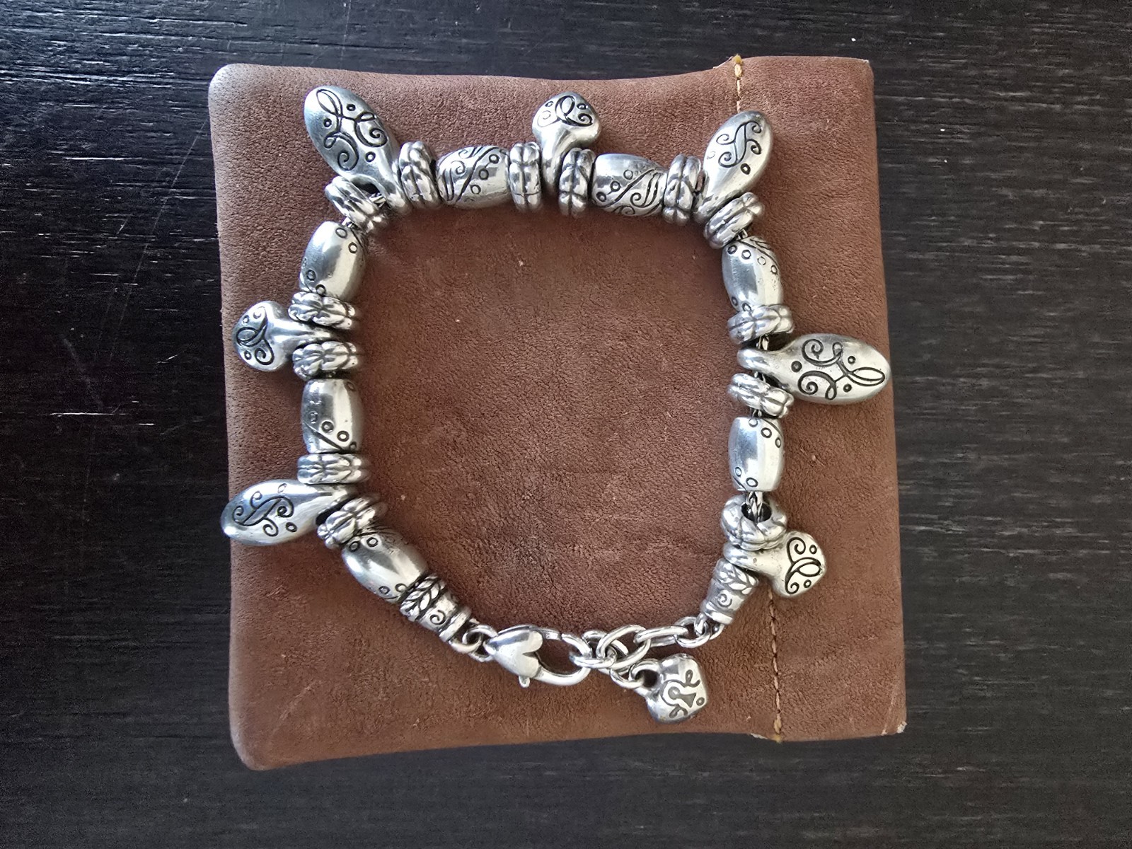 The BRIGHTON Vintage Teardrop Charm Silver Bracelet is a stunning piece of jewelry designed for women. Made of silver plated mixed metals, this charm bracelet features a teardrop shape charm that adds a touch of elegance to any outfit. With a lobster clasp for easy closure, this bracelet is adjustable in length from 7'' to 8 inches to ensure a comfortable fit. Perfect for adding a vintage touch to your look, this bracelet from the trusted brand Brighton is a must-have accessory for any jewelry collection.