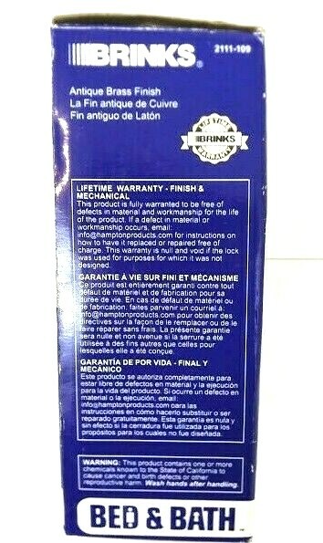 Brinks Door Knob Lock Antique Brass Bed And Bath Hardware Lifetime Warranty The Brinks Door Knob Lock in Antique Brass (Model 2111-109) is a stylish and classic addition to any bedroom or bathroom door. This high-quality hardware is backed by a lifetime warranty, ensuring durability and security. The antique brass finish adds a touch of elegance to the room, making it suitable for both interior and room doors. With easy-to-follow instructions and all necessary fixings supplied, this door knob lock from Brinks is a practical and beautiful choice for your home improvement project. *** Item Descriptions *** Brand - Brinks Condition - NEW Color - Antique Brass Type - Door Knob Style - Antique Brass Item Includes - Hardware, Instructions Model # - 2111-109 Made In - China