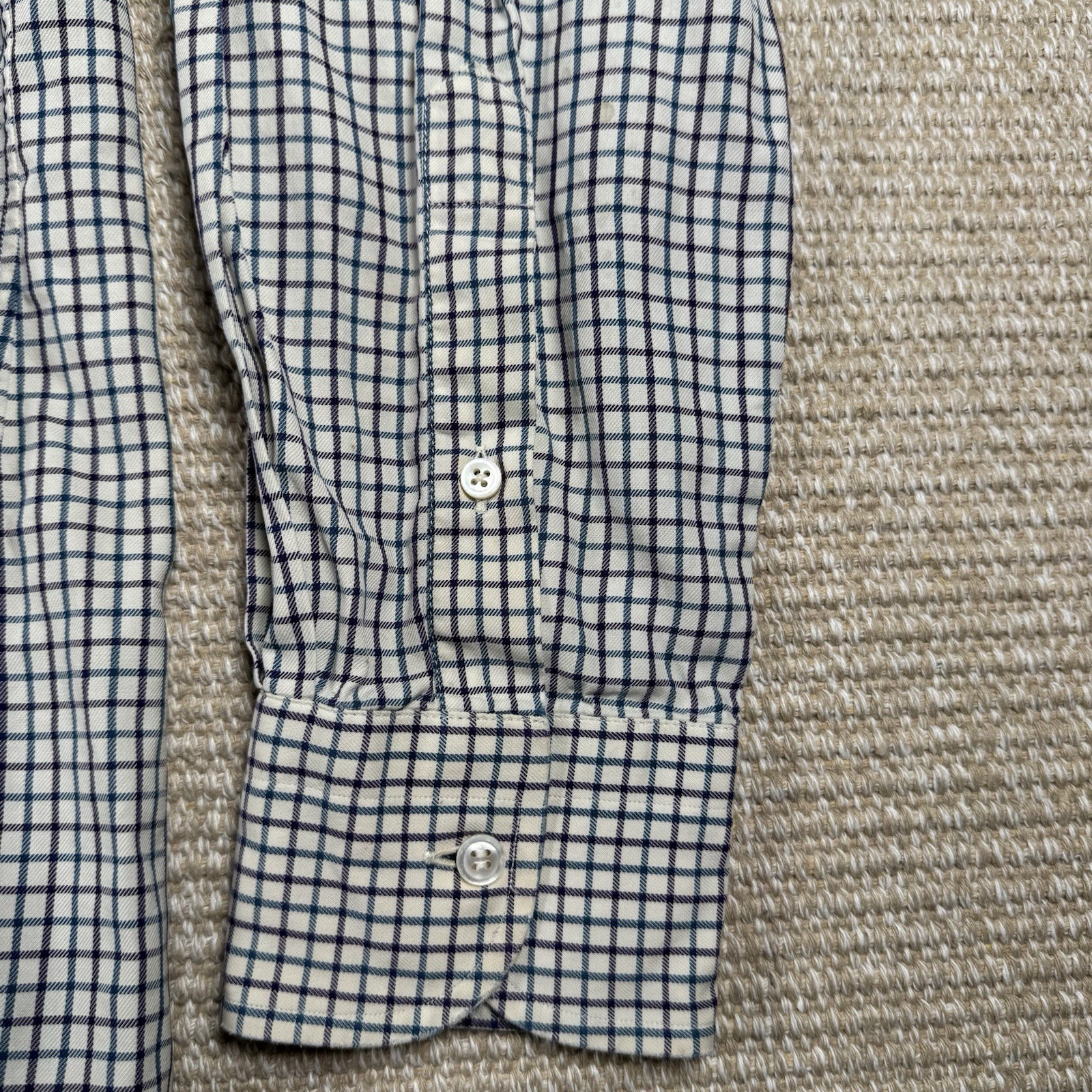 🔥 Quick-Hit Highlights • • Ultra-prestige Brioni craftsmanship — handmade Italian luxury • • Elegant navy & teal micro-check pattern in a timeless business style • • Pure 100% cotton, silky, breathable, and beautifully structured • • Size 17 / 43 with a refined, upscale silhouette • • Small faint marks noted (pictured) — priced accordingly ⸻ Brand & Line • • Brioni, one of the world’s most elite menswear houses (Rome, est. 1945) • • Synonymous with bespoke-level shirtmaking and discreet luxury • • Signature Brioni script embroidered tag inside collar • • Always handcrafted in Italy — the pinnacle of European shirting ⸻ Fabric & Construction • • 100% luxury cotton — smooth hand feel with a subtle luster • • Tight micro-check in navy & teal on a cream base • • Thick, iridescent buttons (mother-of-pearl–style) • • Structured collar & French-style placket • • Double-needle stitching throughout — Brioni’s hallmark precision • • Made in Italy, as shown on the inner label ⸻ Fit & Size • • Tagged 17 / 43 • • Chest (pit-to-pit): ~23.5” • • Length (collar to hem): ~31” • • Brioni fit: tailored but comfortable — refined dress shirt silhouette • • Works with suits, sport coats, or elevated business-casual looks ⸻ Style & Versatility • • A classic Italian dress shirt for office, formal dinners, or luxury travel • • Blue check pattern pairs with navy, grey, tan, olive, or denim • • Elevated enough for tailoring, relaxed enough for weekend smart-casual • • Truly a buy-for-life shirt — Brioni ages beautifully