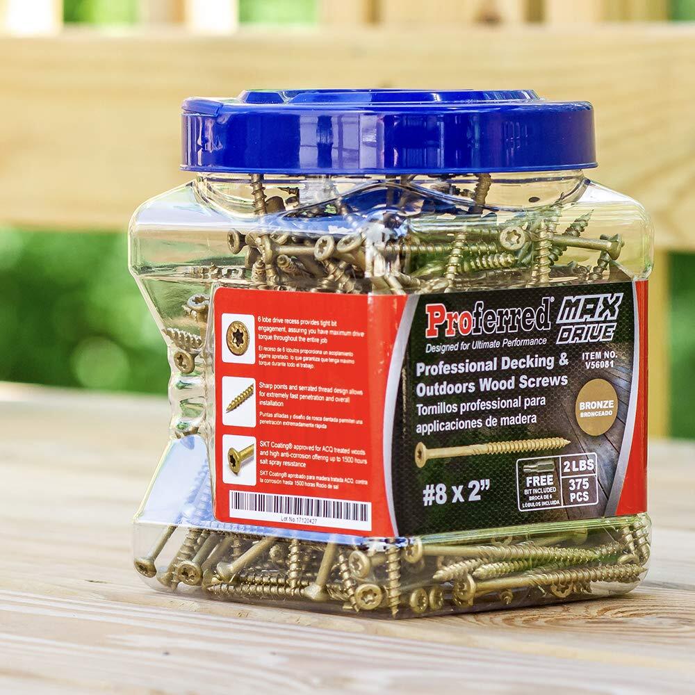Professional Decking & Outdoors Wood Screws, Bronze SKT® Coating - 1500 Hour Salt Spray, #8 X 2, 6 Lobe 20 Drive (375pcs with 1 Bit in Jar) Model Number: V56081 #8 X 2",6 LOBE 20 Drive (375pcs with 1 Bit in Jar) Requires no pre-drilling For use in decking, fencing, and all exterior wood applications Compatible for ACQ treated wood SKT Coating - 1500 hour salt spray Shipping We offer FREE shipping on all orders! We ship within Three business days of payment, usually sooner. We use a selection of shipping services such as UPS, FedEx, USPS etc. We only ship to the lower 48 states, no APO/FPO addresses or PO Boxes allowed. Local pickups and combined shipping options are not provided at this time. Return You can return a product for up to 30 days from the date you purchased it. Any product you return must be in the same condition you received it and in the original packaging. Please keep the receipt. Payment We accept payment by any of the following methods: PayPal Please pay as soon as possible after winning an auction, as that will allow us to post your item to you sooner! Feedback Customer satisfaction is very important to us. If you have any problem with your order, please contact us and we will do our best to make you satisfied. Contact Us If you have any queries, please contact us via ebay. We usually respond within 24 hours on weekdays. Please visit our eBay store to check out other items for sale! Thank you for shopping at our store.