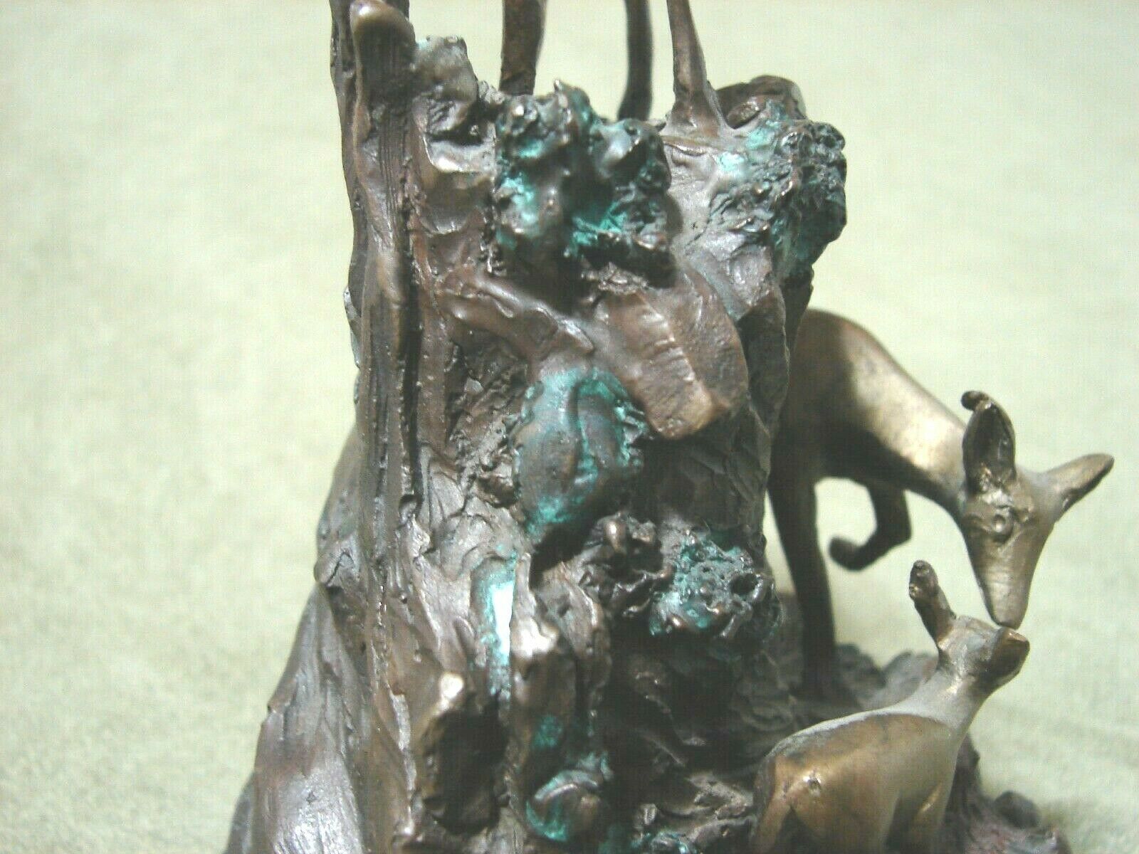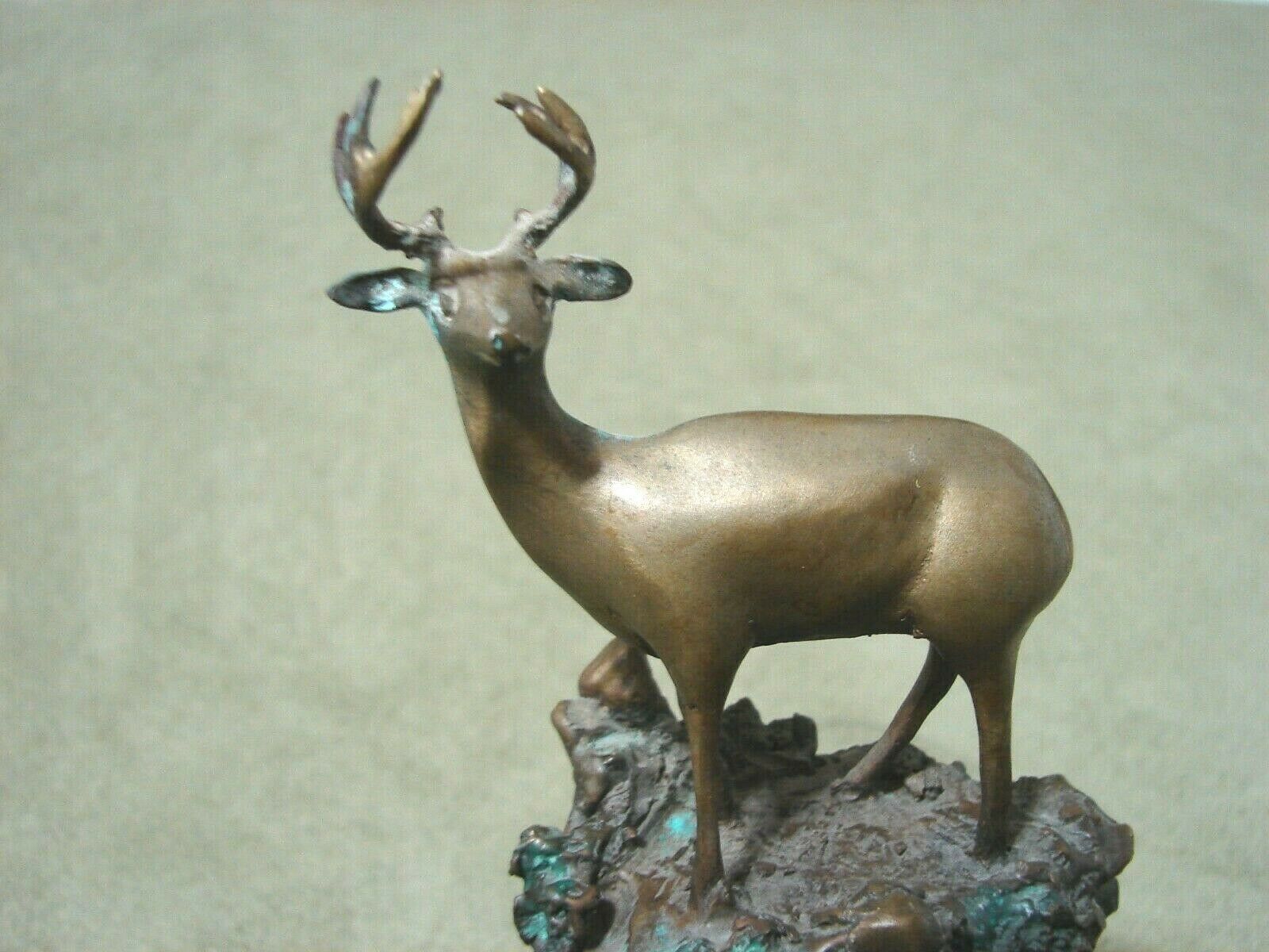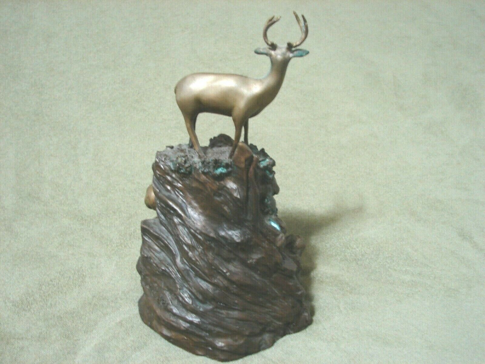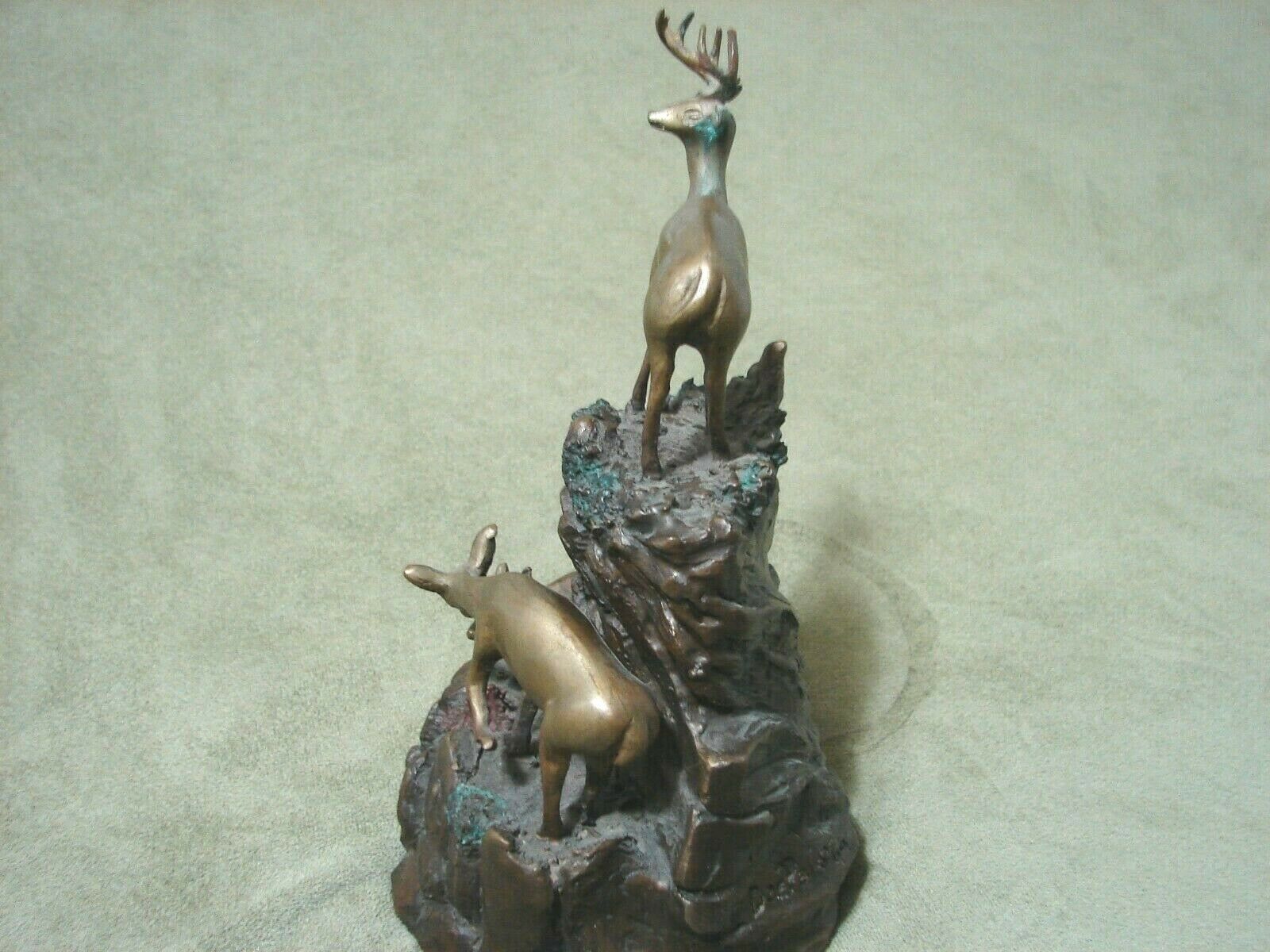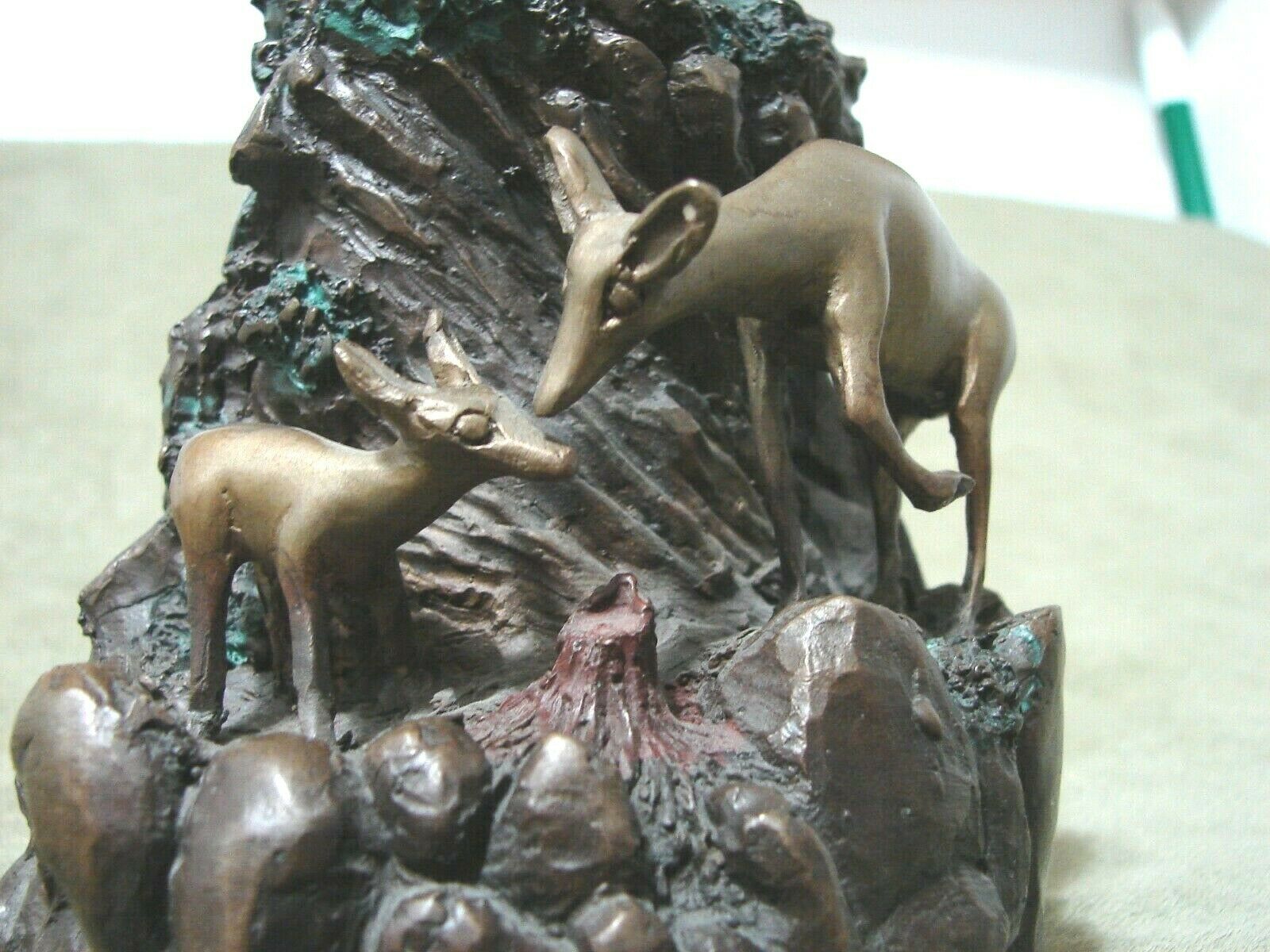 This bronze/metal sculpture was created in 1994 by wildlife artist Dan Parker. This is a beautiful recreation of a buck, his doe and a fawn. Very well done and beautiful display of talent by the artist. I have had this urn/art/sculpture for fifteen years now and have decided to make other arrangements when I pass on some day, Hopefully a long time from now. This little five pound 7 1/2" x 4 1/5" funeral urn is hollow with a base held on by three screws in order to insert a small amount of cremains. Displayed on a shelf I have enjoyed it as a piece of art more than anything else. Being this old and never used of course, it does have some patina in the form of a little extra green here and there because of the nature of the metal. (please look closely at the pictures) I was told this was bronze when I acquired it and basically assumed it was because of haw heavy it is and that a magnet will not stick to it. After having it for such a amount of time the surface has acquired a few small spots of greenish tint like brass tends to do. In other words, I can not guarantee this is solid bronze and not bronze coated zinc or some other nonmagnetic metal. This was sold at the funeral home for about $2500.00 over twenty years ago so I really don't have any idea how much it is worth now. Shipping is free via USPS Priority mail with a tracking number. Any questions at all please feel free to ask. Thank you.