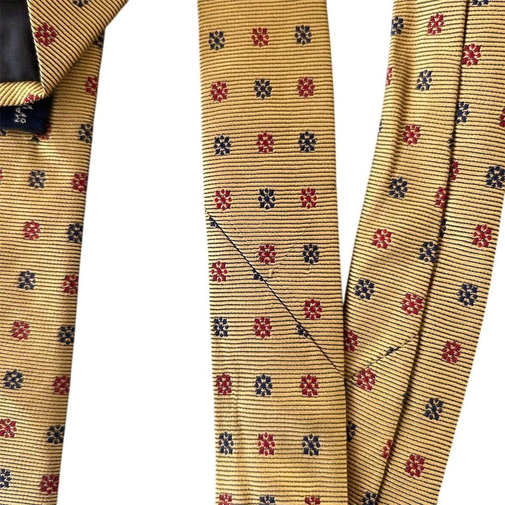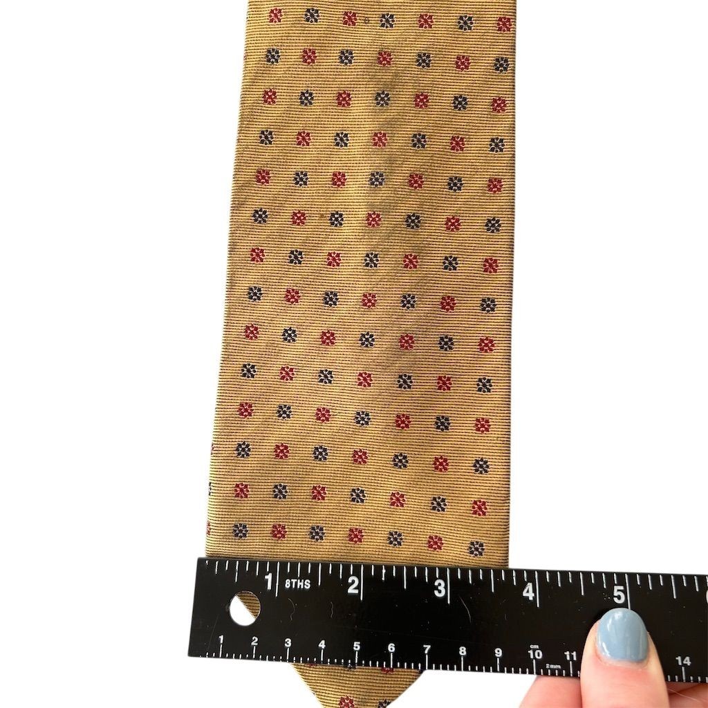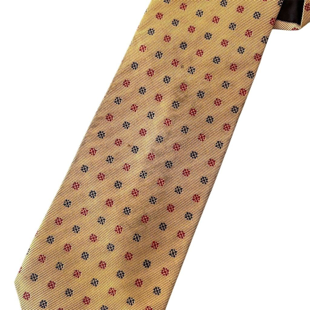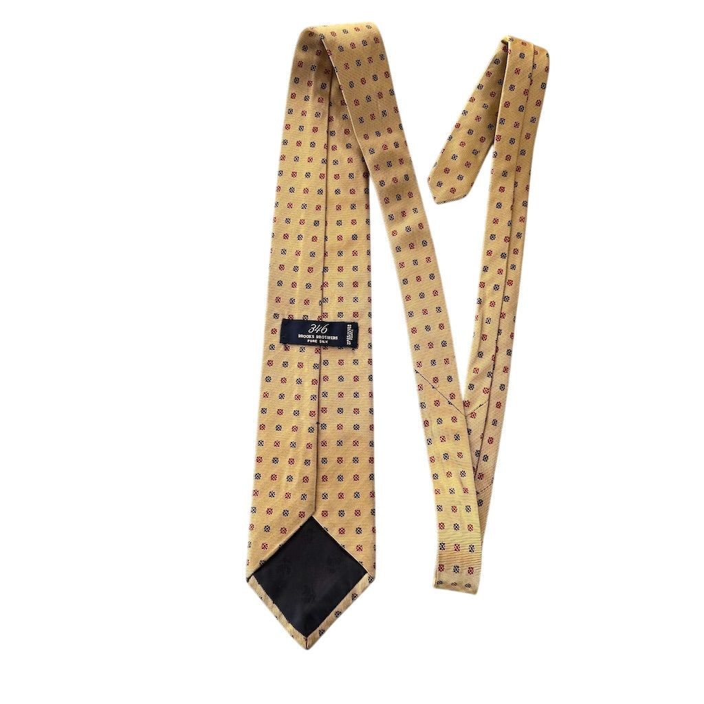 Elevate your wardrobe with this Brooks Brothers gold tie, a timeless accessory that adds a touch of sophistication to any ensemble. Crafted from pure silk, this classic-width tie features a charming polka dot pattern, perfect for both formal events and business meetings. Its adjustable design ensures a comfortable fit, making it a versatile addition to your collection. Whether you're attending a wedding or a corporate event, this tie is sure to impress. The tie is in good condition, with some minor flaws that do not detract from its overall appeal. Stain noted on front unsure if would come out with dry cleaning. Item has been hanging in closet for a while. Snag also noted see pictures Keywords: Brooks Brothers, gold tie, men's accessory, pure silk, polka dot, classic width, formal wear, business attire, adjustable, elegant, sophisticated, versatile, wedding, corporate event, classic length. Brand: Brooks Brothers Color: Gold Department: Men Type: Tie Material: Pure Silk Pattern: Polka Dot Item width: Classic Country of origin: United States Item length: Classic (57"-60") Features: Adjustable Size: One Size Number of pieces: 1 Piece Smoke free household. Pet friendly household. Please see pictures for measurements. Feel free to reach out with any questions and we’ll try to answer as best we can.