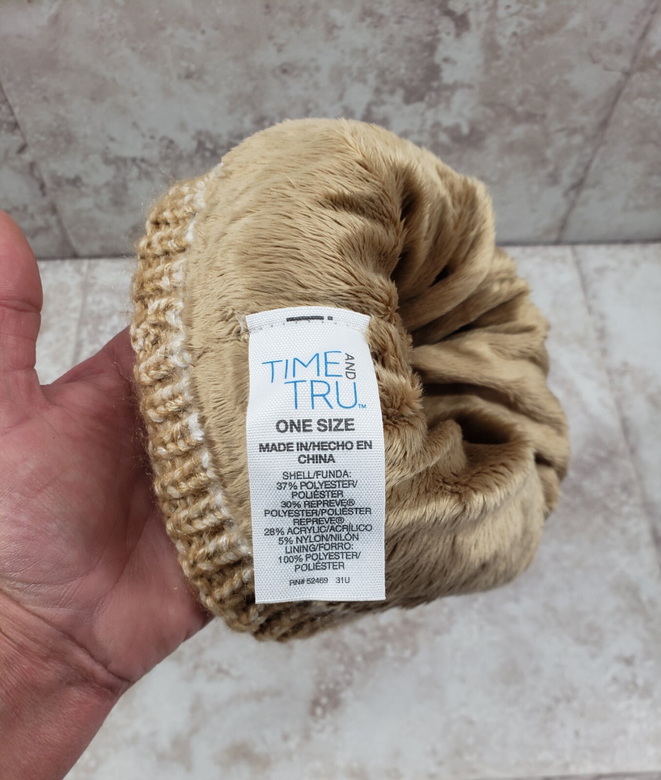 NWT Time & Tru Beanie Cuffed Fleece Lined No Pom Toboggan One size. Two tone stripe pattern. Faux fur, fleece lined. Mfg color: Brown Acorn. Machine washable. Made in China. Shell: 37% Polyester, 30% Repreve Polyester, 28% Acrylic, 5% Nylon. Lining: 100% Polyester. Beanie is new, unused; tags attached. #boho_winter_hat #accessories_soft #timeandtru_nopom #sustainibletextiles #repreve_recycledpolyester SKU 240136-1, -2
