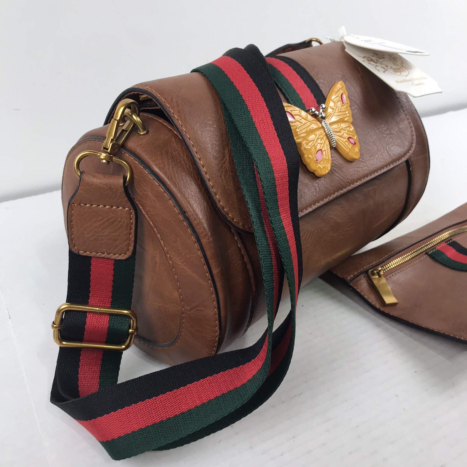 Yellow, Red, & Silver Butterfly Metal Appliqué. 9inHX10inW. Snap & Zip Closure. Depth-7in. Large Open Area With 1 Open Pocket. Adjustable & Removable Double Straps-14in. Red, Black, & Green Striped Straps. Gold Bottom Studs. Wallet-9inWX6inH. Gold Zip Closure With Green, Red, & Black Stripes Also.