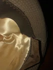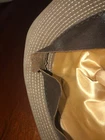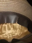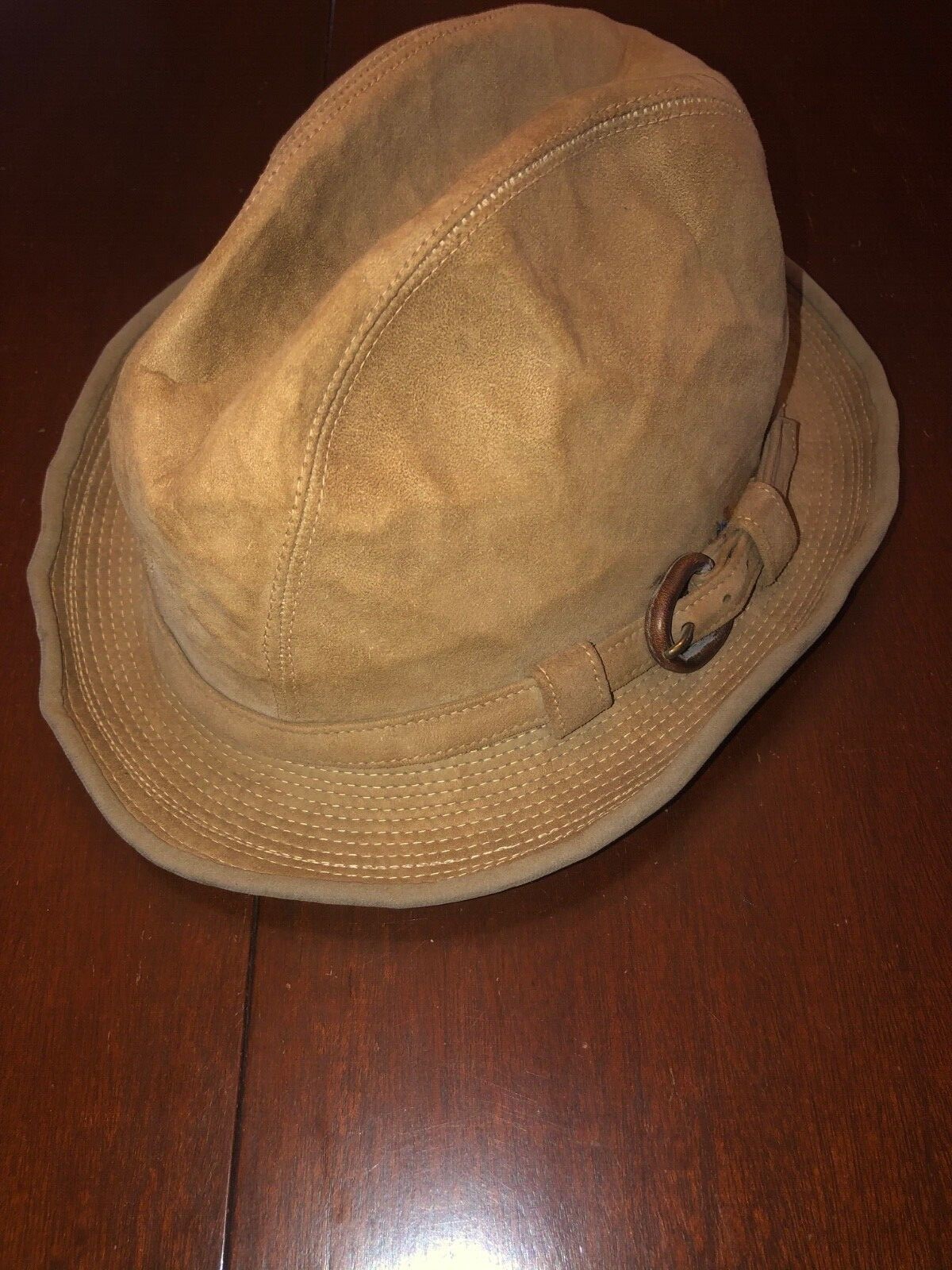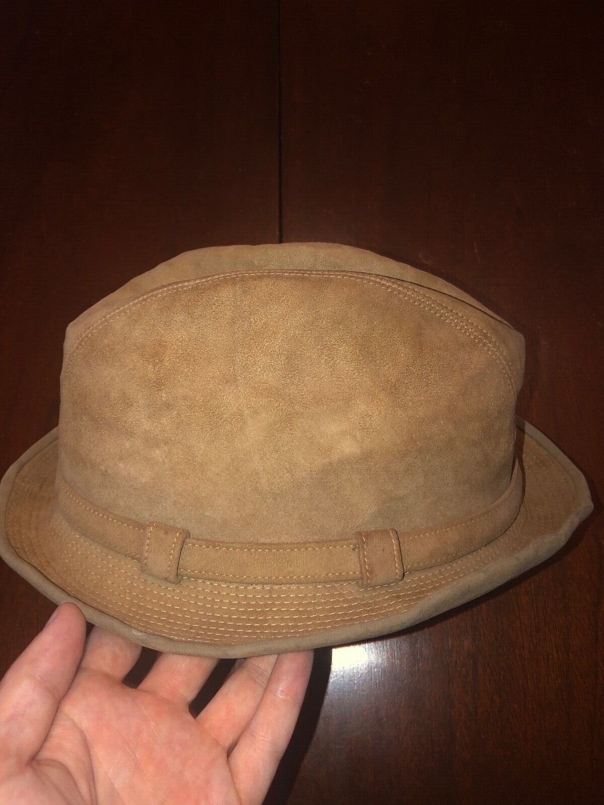 Fedora “Country Gentleman” No size Brown Leather/ Nice SUEAD? HAT (Inside Worn). SUEAD? Fedora (No Tags) Marked “COUNTRY GENTLEMAN” on top inner “GENUINE LEATHER” on inner headband DAMAGE : RIPS on inner “Leather” band from drying out over time and cracking as leather will do. (RIPS IN PHOTOS)