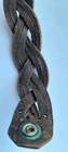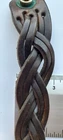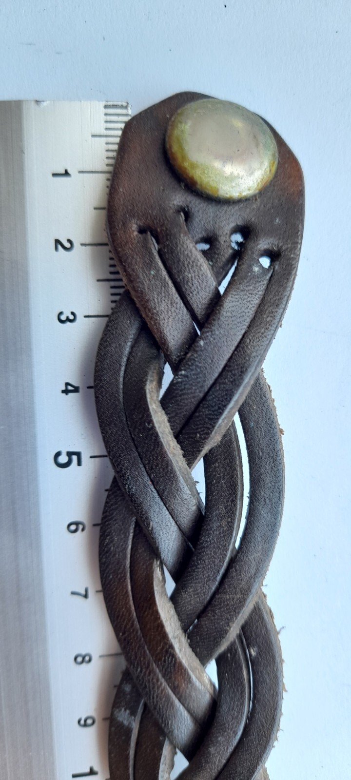 Bracelet Brown Leather Plaited Stud Fastener (AU,6).Measures approx 20 cm long, so I would say size small.Width 2.5 cm.No stretch thick sturdy dark brown leather plaited bracelet wirh stud fastener.See photos some verdigris marks around Stud and small mark on leather.Also have other jewellery listed.Could combine postage