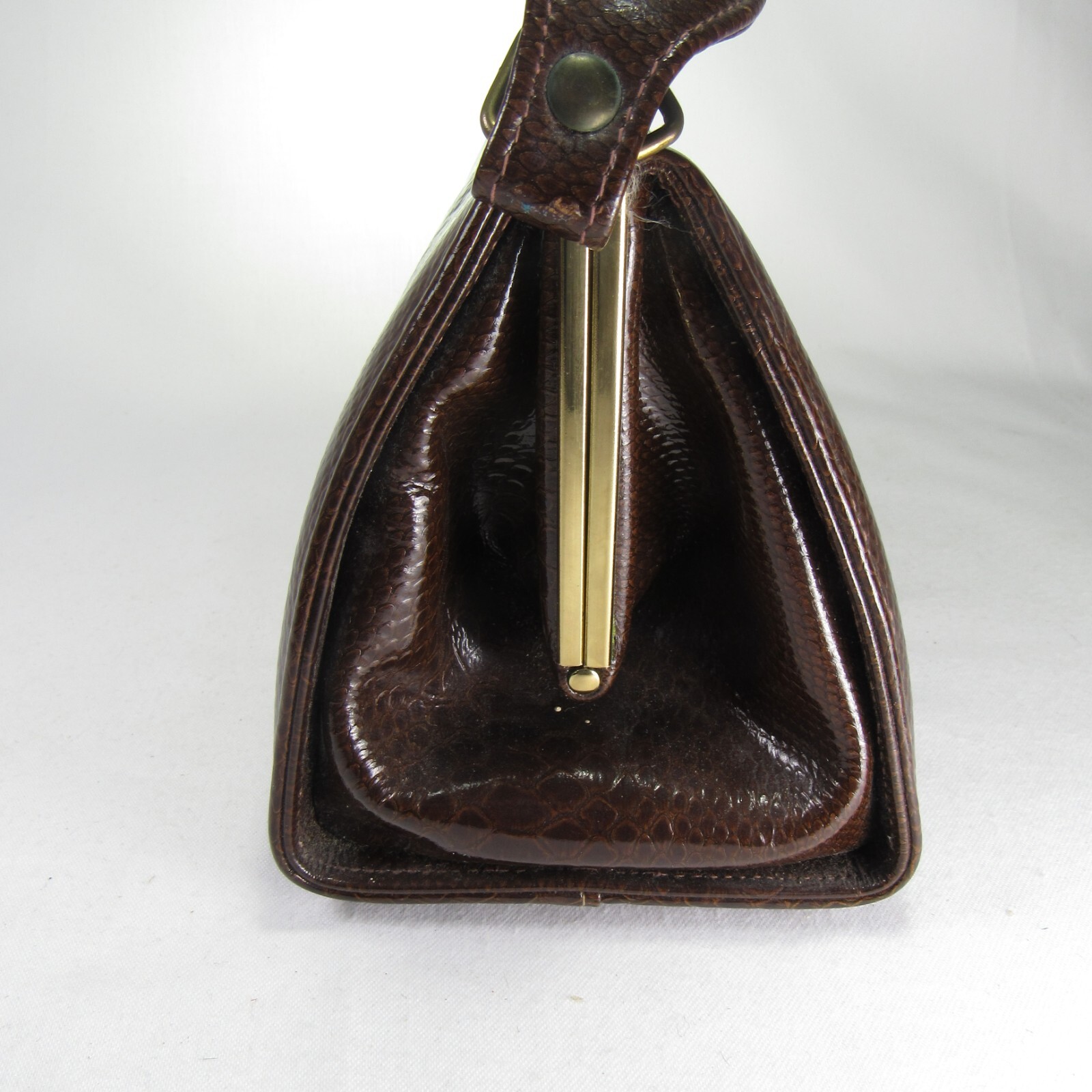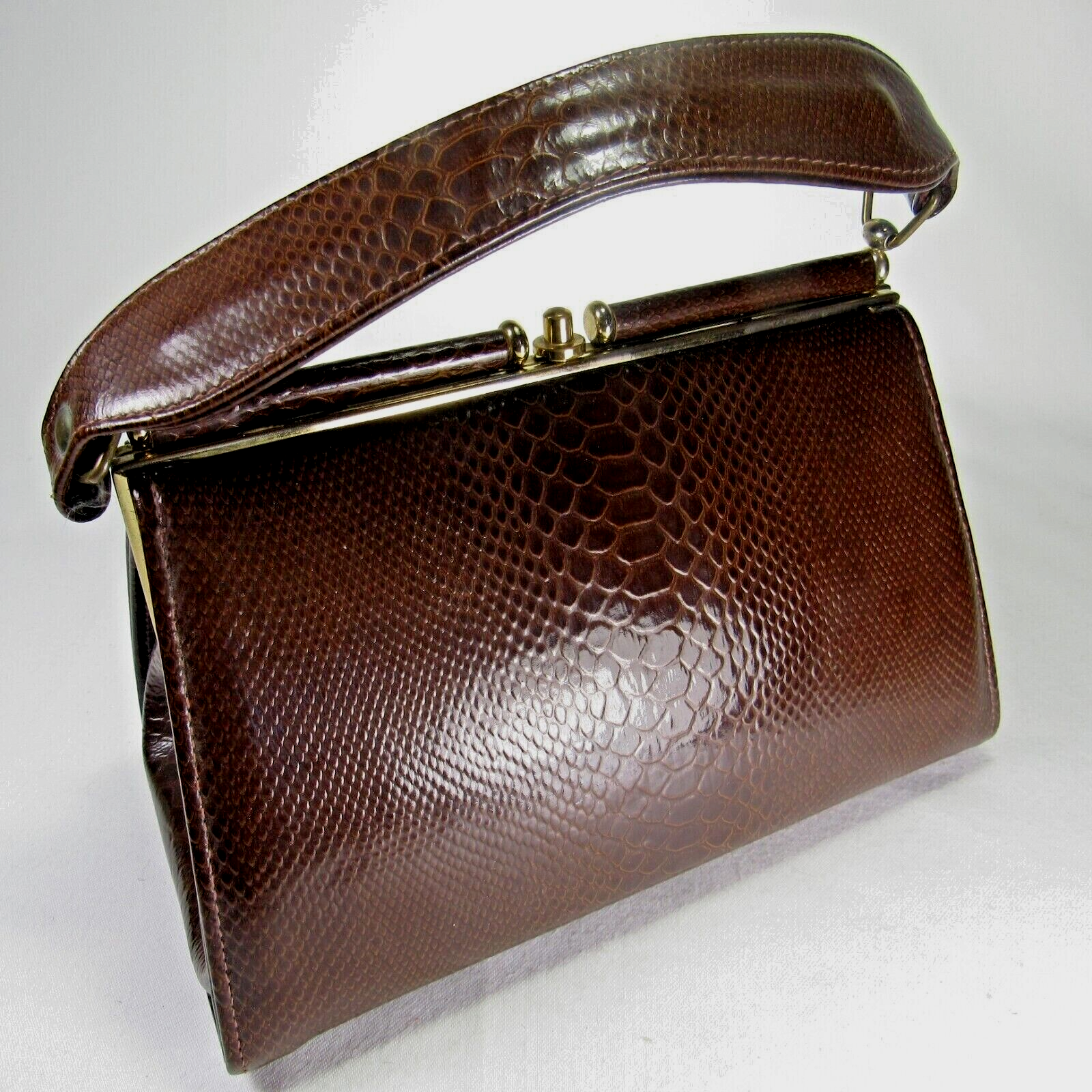 Brown Snake Skin Handbag / Purse / Pocketbook Features: Brown Snake Skin 10" Handle Metallic Hinge with Snap Closure (minor color loss) Interior Stamp 'Made of Genuine Leather' Very Good Gently Used Condition VQF 5510 **************************************************** Looking for more great vintage Quality Finds then, please, visit our ! . You will find a great selection of collectibles, re-purposed and unusual items that would be a great addition to your collection. Looking for the perfect or unusual gift, we may have it for you. Thank-you for your visit. ************************************************************************************** Shipping: We ship USPS Priority Mail, First Class and Media Mail, Fedex or UPS from Florida. We use eBay’s shipping calculator to determine shipping cost. Policies We describe items to the best of our ability. We are not experts. We know vintage, previously owned and loved items are not always perfect. We try to describe items as accurately as we can, list any flaws or defects that we can see. Most items listed are from estate sales so will do our best to take good pictures. We would never intentionally try to misrepresent an item or mislead a buyer. If we do make an error, PLEASE bring it to our attention, we always want people to be happy. Please review the listing and photo(s) carefully before bidding. Feel free to contact us with further questions.