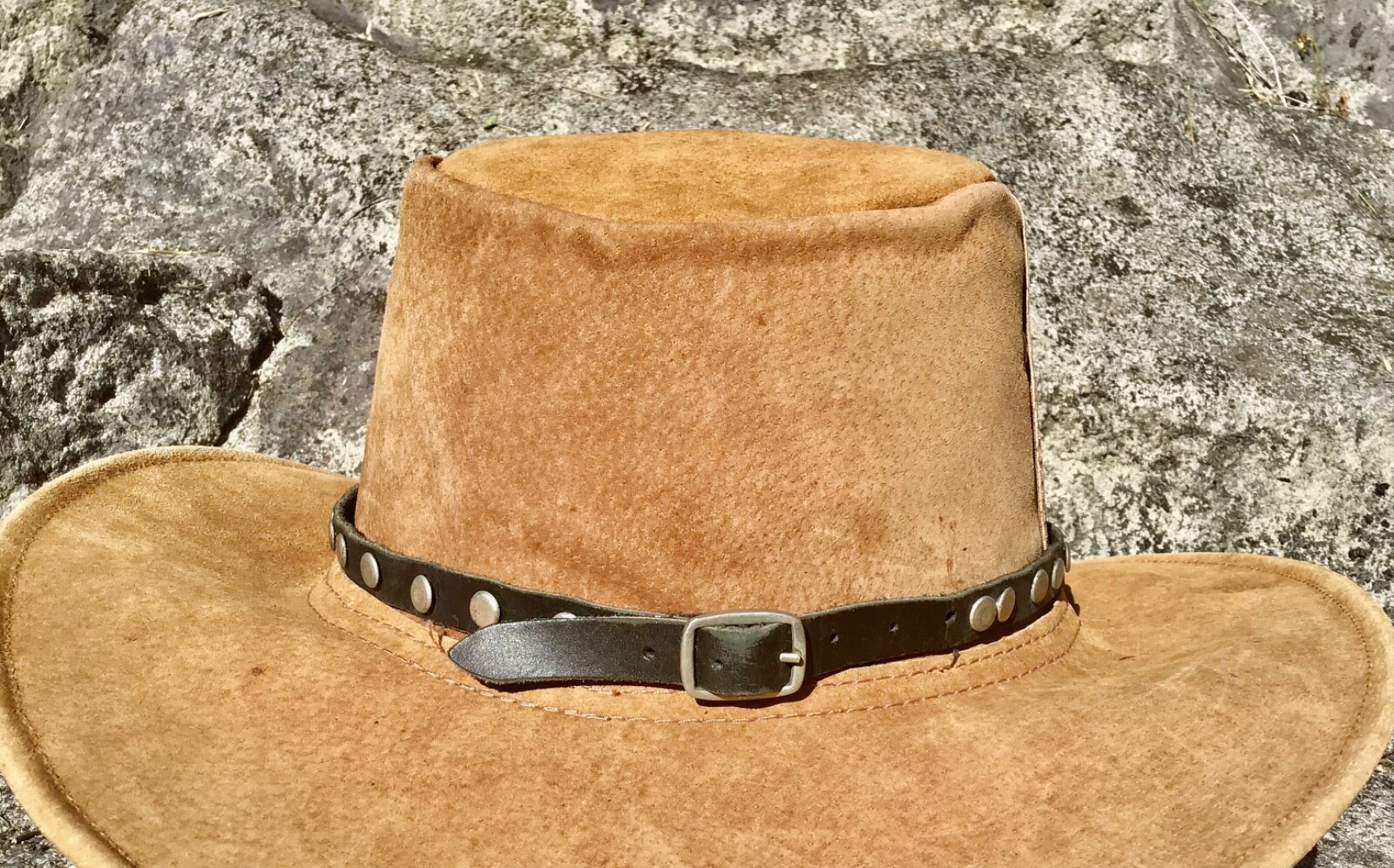 Buffalo leather hat band with buckle and studs fits all hats Australian made