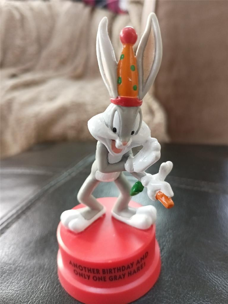 Applause Bugs Bunny Another Birthday Gray Hare PVC Figure Looney Tunes 1994 Cake Applause Bugs Bunny Another Birthday Gray Hare PVC Figure Looney Tunes 1994 Cake Click images to enlarge Description You are looking at an Applause 1994 Looney Tunes Bugs Bunny Figure that is in EUC. Bugs has a great saying of "Another Birthday And Only One Gray Hare". It is in excellent condition with the UPC label on back and wasn't "used" per se but I listed it that way. See pictures. Great as a cake topper or just a cute little Bugs joking about only one gray "hare" vs "hair". This will be shipped securely. NOTE: I ship very fast- I do "click N ship" which means as soon as you pay, I do a label and my postal carried picks the item up at my door. Shipping HOW I ship: USPS First Class or Priority Mail with DELIVERY CONFIRMATION . Priority Mail includes INSURANCE and Delivery Confirmation . Combined Shipping: I LOVE to combine shipping to save you money. I adjust it based on the weight of all of the items together, size of the box (new thing with USPS), and distance. Please contact me for a quote on combined shipping. Speed of Shipping: I SHIP VERY FAST with Click N' Ship. You pay, I print, and my postal carrier picks the item up at my front door. You're not waiting for me to drive to the Post Office, wait in line etc.... IMPORTANT: Once the Post Office has your package, I have no control over what they do or how long it takes them to get it to your door. Tracking is uploaded and you can follow your item daily online on your eBay purchases page. Allow enough time for your item to get to you (especially if it's gift, holiday or a birthday party item). FYI "guaranteed" arrival times by the post office on their website and on eBay are only "estimates" so again, plan accordingly. The ONLY guaranteed speed for USPS is EXPEDITED OVERNIGHT DELIVERY. If you're LOCAL, I appreciate you wanting to save time and me money on shipping. However, most times I cannot meet someone to pick up an item so please accept the shipping terms as going through the Post Office. I do make exceptions on LOCAL if you're near me, or I know you, or the item is LARGE and/or FRAGILE. Terms of Sale I strive to make my buyers happy and offer a return policy on almost all of my auctions with a few exceptions. Please know your sizing ! I give dimensions when selling used clothing to avoid any confusion. Honesty is greatly appreciated. Returns: Items must be returned in the condition in which it was sent. Example: NWT clothing must have the tags on it , cannot be worn or tampered with. I'm the most flexible and easy to work with Ebayer. If there is an issue (which I don't expect there to be) please email me first. About Us I pride myself on being accurate and offering a detail-oriented auction/sale with plenty of pictures. Ebay should be a fun and happy experience for both buyers and sellers. Contact Us Please feel free to contact me through Ebay with any questions. Get images that make Supersized seem small. Showcase your items with Auctiva's Listing Templates! THE simple solution for eBay sellers. Track Page Views With Auctiva's Counter