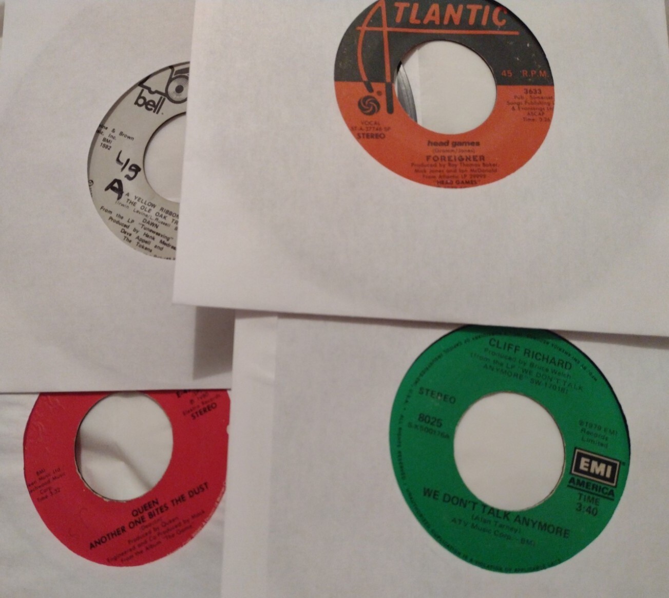 lot of 45 rpm vinyl records for arts and crafts Wholesale listenable . Artists include sticks Foreigner Queen Crystal Gayle Eddie Rabbitt Charlie Daniels Tony Orlando and Dawn and many more. Sold as is, some may have scratches but should still be listenable.