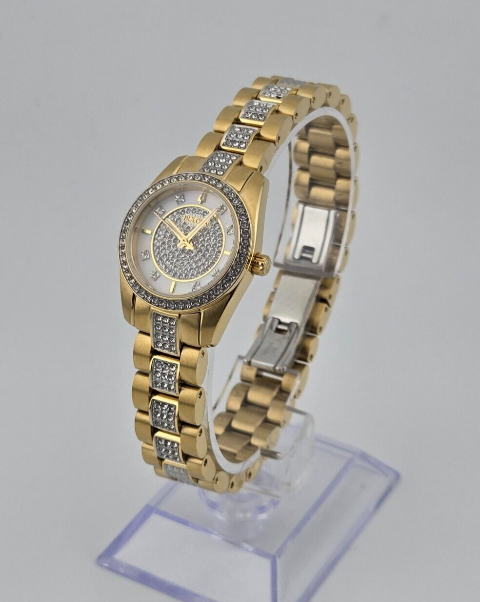 Bulova Classic Diamond Dial Stainless Steel Women's Watch - 98L307 ($450 MSRP) With Gift Box! This watch is a Shelf Pull from one of the Major Department Stores. Watch has micro scratches on the watch case/band, visible under direct light . The Bulova Classic Diamond Dial Stainless Steel Women's Watch (Model 98L307) is the epitome of elegance and sophistication, designed for those who appreciate timeless style. With a sleek 23.5mm round case made from crystal, this watch exudes a refined presence, perfect for formal or dress occasions. The stunning white dial is adorned with sparkling diamonds, adding a touch of luxury that elevates the overall design. A gold-tone bezel and a gold-plated bracelet complete the ensemble, creating a harmonious blend of precious metals that exude both class and charm. Crafted to deliver both beauty and functionality, the Bulova 98L307 features a precise analog display, ensuring accurate timekeeping. The gold-plated bracelet provides a comfortable fit while adding a luxurious feel to the watch. With water resistance up to 30 meters (3 ATM), it is ideal for everyday wear, offering a level of protection against splashes or brief immersion in water. This watch is a perfect accessory for women seeking a stylish yet practical timepiece that effortlessly complements both casual and formal attire. Manufactured between 2010 and 2019, the Bulova Classic Diamond Dial Stainless Steel Watch continues the brand's legacy of quality craftsmanship and attention to detail. Whether you're dressing up for a special event or adding a touch of elegance to your everyday look, this watch makes a statement with its refined design and luxurious materials. With its diamond accents and gold-plated band, this classic wristwatch combines sophistication and timeless beauty in one stunning package. Features Model: 98L307 Bezel Color: Gold Band Color: Gold Dial Color: White Case Size: 23.5 mm Water Resistance: 30 m (3 ATM) Band/Strap: Bracelet Department: Women Type: Wristwatch Band Material: Gold Plated Watch Shape: Round Style: Classic Dress/Formal Case Material: Crystal Display: Analog Fast and Free Shipping You're already purchasing the item. Why pay additional for shipping, especially slow shipping? We get your order shipped out within 1-business day and delivered to your doorstep as quickly as possible. Competitive Pricing With our dynamic pricing model, our prices are always competitive. Our prices are some of the lowest that you will find on the internet. Rest assured that you're getting a good deal when purchasing with us. 30-day Money Back Guarantee We are committed to making sure that you leave this transaction satisfied. If you're unhappy with the product for any reason, you may return it back for your money-back or a replacement within 30 days. No questions asked!