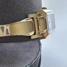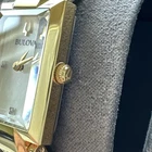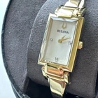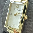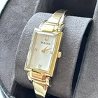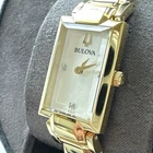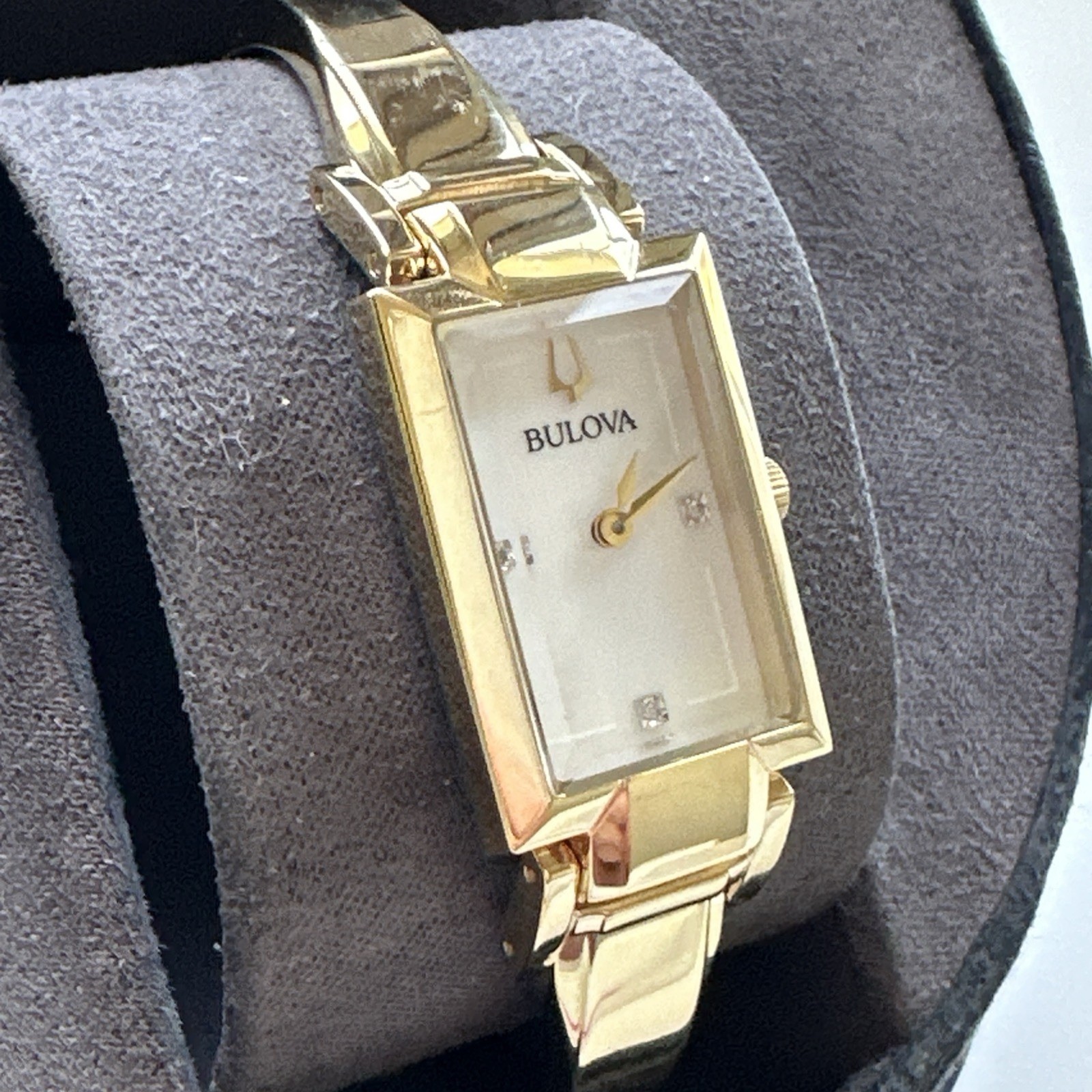 Bulova Bangle Ladies Diamond Gold Plated Stainless Quartz Watch 97P141 ITEM DESCRIPTION Retail Price: $325.00 BULOVA BANGLE LADIES DIAMOND QUARTZ WATCH - Polished Gold Plated Stainless Steel Case and Bracelet - Mother-of-Pearl Dial - Gold Tone Hour and Minute Hands - 3 Genuine Diamond Hour Markers - Mineral Crystal - Water Resistant - Fold Over Clasp - Model # 97P141 - Case Diameter 18mm - Case Thickness 7mm - Bracelet Width 14mm - SKU # 2151102423 GUARANTEED 100% AUTHENTIC Stock 816
