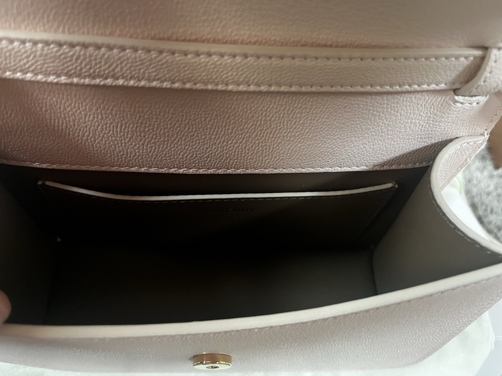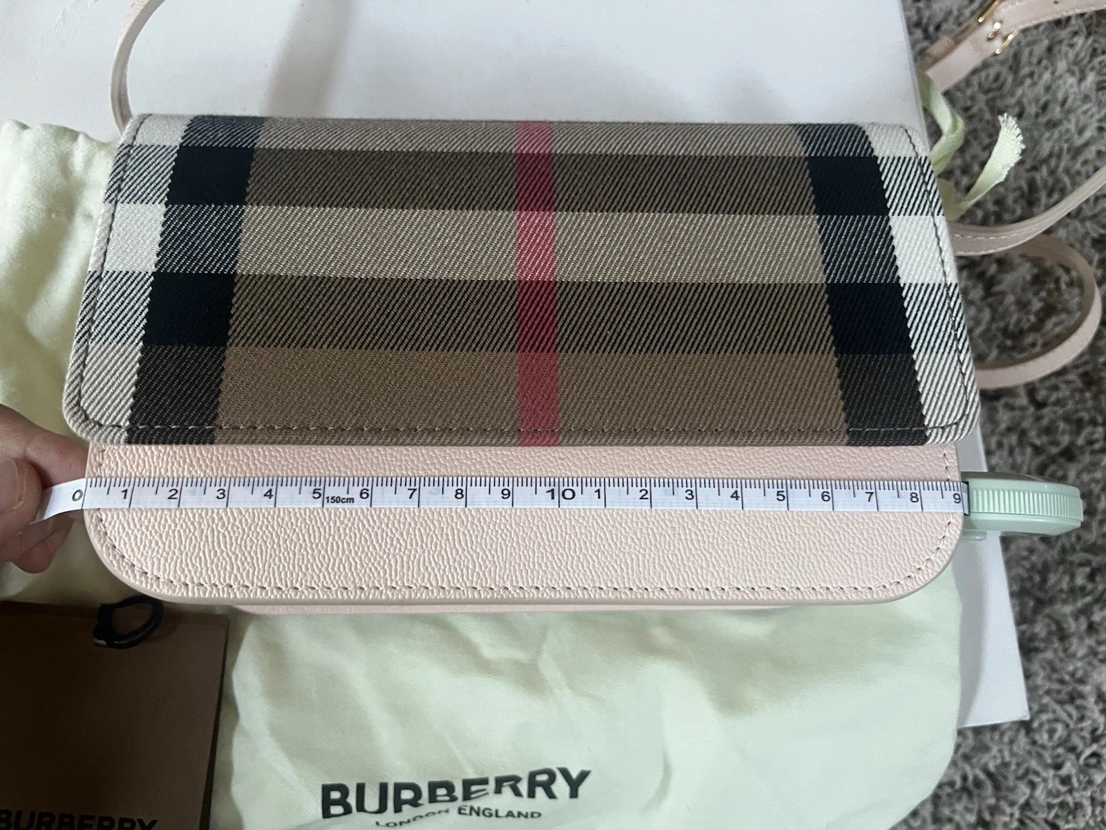 This is a Burberry Madison Check and Leather Crossbody Bag in beige check canvas with light pink leather trim, snap closure with adjustable straps. Comes with dust bag