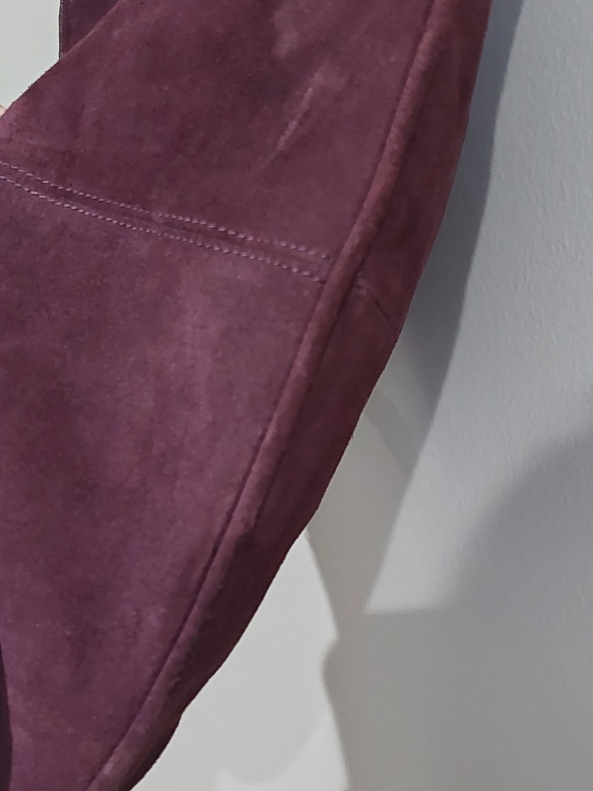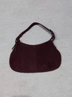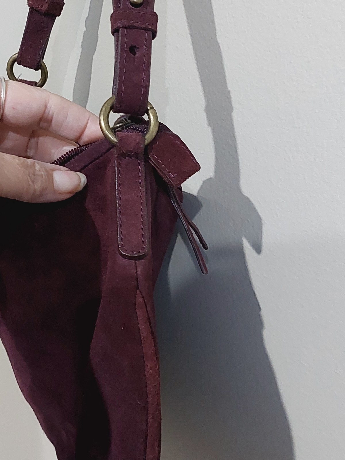 Style and Shape: Hobo bags are generally characterized by their slouchy, relaxed silhouette and crescent shape. This bag fits that description, with a soft structure that lacks rigidity. Material: The bag is made of a soft, purple Burgundy suede material. Features: It has a single, adjustable shoulder strap and a zipper closure The slouch is slight not prominent