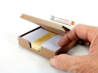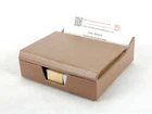 Business Card Holder w/Sticky Notes & Scratch Paper, Recycled, Sweda# DK8000 Handy desktop memo center made from recycled paper products Measures 3.75"W x 3.75"L x 1.25"H Business card display rack holds about 50 cards Fold-out sticky note center assorted as follows: 3.25" x 2.25" yellow sticky notes ~ 25 sheets 5/8" x 2.25" sticky flags pastel shades, 20 each of five colors Includes generous stack of loose leaf scratch paper In stock and ready to ship direct from our Ohio warehouse