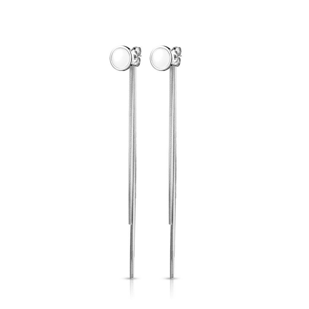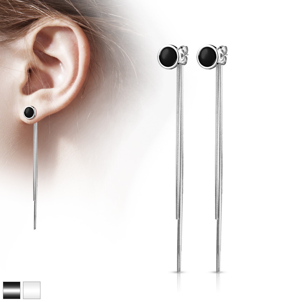 Round Enamel Stud Earrings with Dangle Chains attached to the Butterfly Backs 316L Surgical Steel - Hypoallergenic Choose Colour: Black or White Each pair supplied Gift Boxed Fast Delivery: All orders shipped 1st class within 24 working hours!