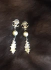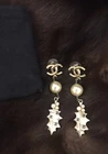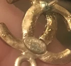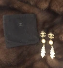 Gorgeous and unique long statement earrings. The CC on the lobe has a subtle and unusual satin finish that also flashes tiny sparkle flecks. The large golden pearl is in fine shape, some crazing visible through a loop and there is a tiny bit of verdigris where the leaf is attached. The leaf has a glowing hand finished look with stamped in black CC logo embellishments and a cluster of soft white slightly opal tone berries. I’ve never seen a pair like these with such detail, varied designs and textures. I bought these from the Rodeo Drive CHANEL store during the 2005 collection. They are signed (copyright) CHANEL (registered) 05 CC A Made In Italy. Includes padded black ultra-suede flat pouch with slit opening and embossed CC logo.
