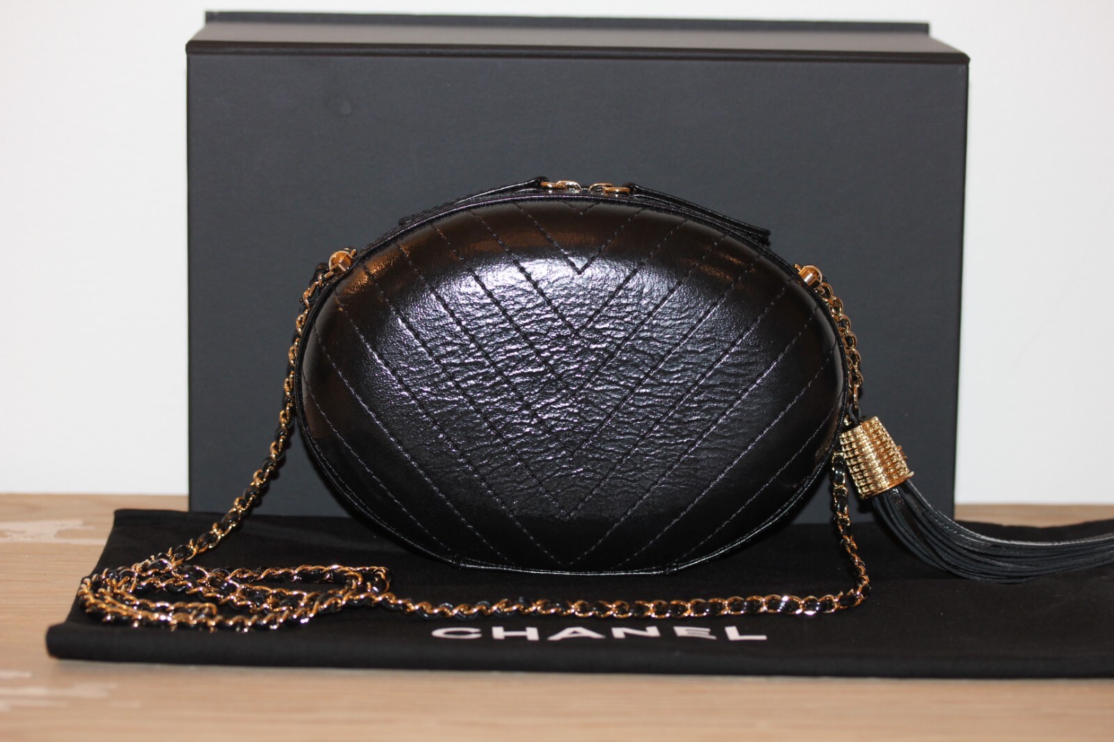 ~100% AUTHENTIC GUARANTEED~ CHANEL Made in France LA PAUSA Chevron OVAL Crossbody Shiny glazed classic black leather exterior!! Large LA PAUSA font in white at front!! Signature leather woven chain!! Shiny champagne gold color signature engrave herdware!! Large tassel charm adorned at one side!! Features one main dual zippered compartment with tonal black lamb leather interior!! WOW!!! WOW!!! WOW!!! Absolutely fabulous and excellent pre-owned collector condition overall. Clean and bright inside and out! Slight waves in the tassel fringe. Slight wrinkles at bottom hinge area from normal-light open/close. No damage and no odors to report. Comes with a Chanel ribbon dust bag only (*the box shown in photos has been sold). Enjoy!! ***LADIES!!! Don't miss you're chance to own this super special collector CHANEL bag!! Rare!!*** **COLLECTOR AND CELEBRITY MUST HAVE!!!** -PLEASE ASK ALL QUESTIONS BEFORE BIDDING- (PLEASE CONTACT ME BEFORE PLACING A BID IF YOU HAVE LOW FEEDBACK!) AUTHENTICITY I ONLY SELL 100% AUTHENTIC MERCHANDISE FOR BOTH MEN AND WOMEN! Some of my items come with a third party authentication report (noted in each individual listing), but you are welcome to send a link with my listing to an authenticator of your choice pre-purchase as well if you prefer. PAYMENT **Please send payment within 48 hours to avoid eBay's unpaid item case from automatically opening. If you will require more time to pay, that is usually not a problem, but please contact me before bidding so we can make any necessary arrangements. SHIPPING I try to only charge actual rates or below since it's already costly, and I do not intend on profiting there, so please reach out prior to purchasing if there seems to be a mistake in the quote. **PLEASE NOTE: INTERNATIONALLY BUYERS ARE RESPONSIBLE FOR ANY ADDITIONAL CUSTOMS FEES OR ASSOCIATED COSTS AND I CANNOT MARK MERCHANDISE AS 'GIFT'. THANK YOU FOR UNDERSTANDING EBAY SELLER PROTECTION POLICY. RETURNS Please understand that as a small business, personally owned and operated, returns are extremely complicated for my book keeping. * If you have any questions or concerns, please please please ask -prior to purchasing to ensure the process goes as smooth as possible. I will try my best to accurately note any sign of wear or imperfection, so that the item you receive is always as described and exactly what you are expecting -or better! That said, I obviously want you to LOVE your item, so... if you don't, or if something flew under my radar, kindly contact me and we can discuss any options, before rushing to open a case with eBay. If you do need to send it back, please let me know within 3 days of receiving it, security tag must still be attached, and item must be in the same condition as you received it. Thank you! About Me: B.Authentic As one of eBay's highest ranking, award winning sellers, and member since 2008, (also registered reseller), I strive for your 100% satisfaction, only offering 100% authentic items, 100% of the time!! I am blessed to actually love what I do and I take a great deal of pride in my business! I buy, curate, photograph, and list all items myself and try my humanly best to accurately note any sign of wear or imperfection, so that the item you receive is always as described. If by chance I missed someth ing , or for any other reason you were not satisfied with your purchase or my service, please contact me before leaving feedback so i can do my best to earn your full -5 Star feedback score in every category! I sincerely appreciate your interest in my items and I look forward to earning your business! CHECK OUT MY OTHER LISTINGS AND ENJOY READING MY FABULOUS FEEDBACK! *FOLLOW OR ADD ME TO YOUR FAVORITE SELLERS LIST IF YOU LIKE WHAT YOU SEE! NEW ITEMS ADDED OFTEN! THANK YOU! :) -B.AUTHENTIC DISCLAIMER: I am not an authorized dealer of any brand or product. The logos and brand names mentioned are used for identification purposes only and are registered trademarks of their respective owners who reserve the rights of ownership. The use of a designer trademark, brand name or product description in my listing is not intended to suggest that the brand, company or trademark is affiliated or endorses this auction. I am simply selling a personal item as a second party/reseller.