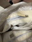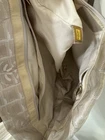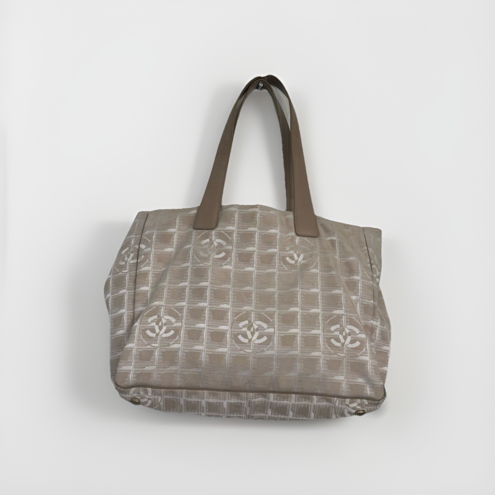 The CHANEL New Travel Line Nylon Jacquard Leather Tote Shoulder Bag is a stylish and spacious accessory perfect for various occasions such as travel, weddings, parties, and formal events. Made with a beige nylon exterior adorned with Chanel logos, this medium-sized bag features a rectangular shape with a shoulder strap handle in beige leather. It includes inner pockets, a chain strap, and gold-plated hardware accents. This authentic Chanel bag from the Travel Line collection is a luxurious and practical addition to any outfit, adding a touch of elegance and sophistication.