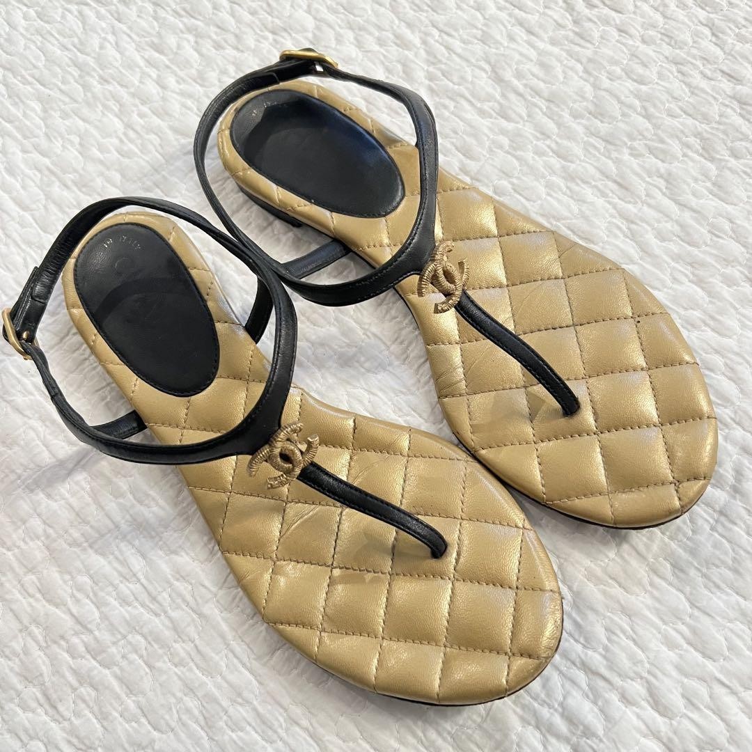 CHANEL Tong Sandals Flat Coco Mark Gold Leather 35 1/2 Used Excellent+ Authentic Description Brand: CHANEL Model: Flat Thong Sandals with Coco Mark Color: Black and Gold Material: Leather Size: - EU: 35.5 - US: 5.5 - JP: 22.5cm Condition: Very good, minor signs of use; no noticeable damage or stains All of Items Will be Shipped From Japan. Please check with the image. About the condition Damages such as stains, scuffs, and scratches are listed only if they are noticeable. Please understand that this is a used item, so there may be some inconspicuous scuffs or signs of use even if they are not listed. Please note that there may be unnoticeable scuffs and scratches on the item even if they are not listed. Please check the images for details of the condition. Note: This is a used item. We have tried to describe the condition of the item with detailed pictures and text as much as possible, but please understand that there may be some things that we have overlooked because it is a used item. Please note that measurements are taken by our company, so please understand that there may be some errors. If there is no special description about the accessories, only this item will be included. Colors may look different from the actual item depending on your monitor and shooting environment. Payment Please pay within 7 days of first purchase. ebay payments We can not separate invoice. Please understand. Shipping&Handling ■Speedy Shipping Shipped by DHL, FedEx, or Japan Post with tracking number. *If your location is designated as remote, additional shipping charges may apply. (Some areas such as Australia, Canada, Chile, and remote areas of the U.S.) I will pack it carefully. ■Economy Shipping (Japan Post) Economy Airmail 15-40 days without tracking Additional shipping fees may apply for countries/areas where delivery by Japan Post is not available. Handling Time Please check the categories of Shipping and payments. International Buyers - Please Note: Import duties, taxes, and charges are not included in the item price or shipping cost. These charges are the buyer's responsibility. Please check with your country's customs office to determine what these additional costs will be prior to bidding or buying. If you have any questions about products, shipping, etc., please do not hesitate to contact us by message. Thank you for your understanding.