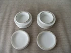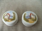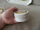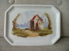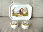 Charming and Unusual Vintage Dressing Table Tray and Two Matching Trinket Pots. Attractive Hand Painted Countryside Scene. Tray Measures approx 26.5cm x 19.5cm. Each Trinket Pot Measures approx 4cm Tall including the lid x 7.5cm Base Diameter. There are some chips but perhaps we can forgive them that as they are so lovely ! Please feel free to ask any further questions. UK BUYERS - Happy to offer postage discounts for multiple purchases where all items can be fitted into the same Royal Mail Parcel. Please wait for an amended invoice before paying. OVERSEAS BUYERS - I only sell via the Global Shipping Programme. Please note that I do not have any control over the GSP postage charged.
