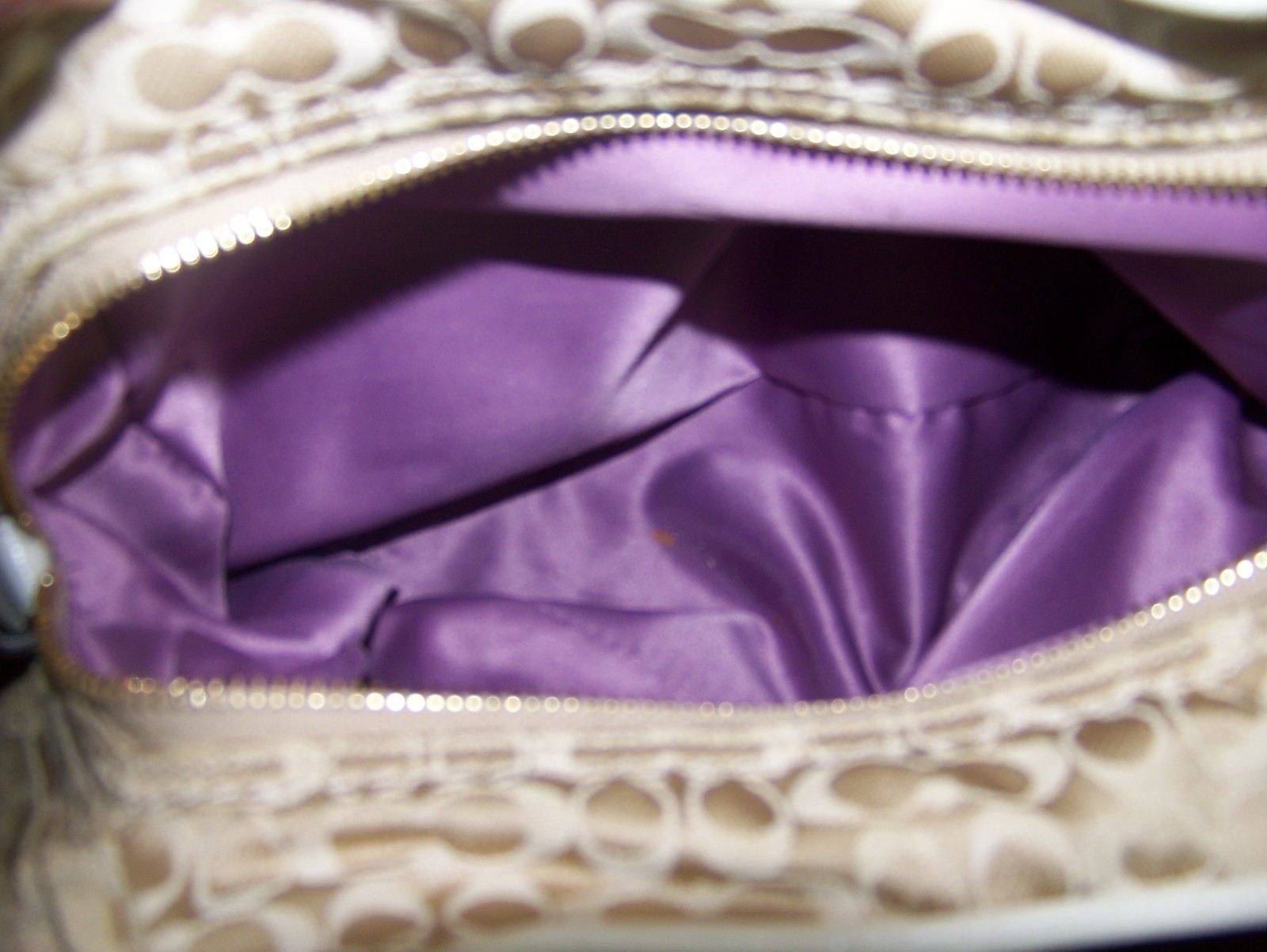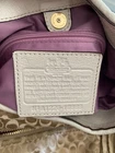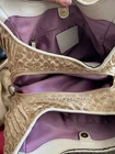 The COACH Madison Maggie Ruched Hobo style Purse in Champagne Gold with beige leather handle and gold -plated hardware is a stylish and luxurious shoulder bag designed for women. Made of canvas with a satin fabric lining, this purse features the signature pattern with both a zip and snap closures. The bag features double handles with a magnetic snap closure. This bag is a large size with 3 compartments with one being a zippered compartment. It measures 13.5" in width, 12" in height and 4"in depth. The gathered style adds a unique touch to the Coach Madison product line. The champagne gold exterior color gives it a sophisticated and elegant look, making it an ideal accessory for any outfit.