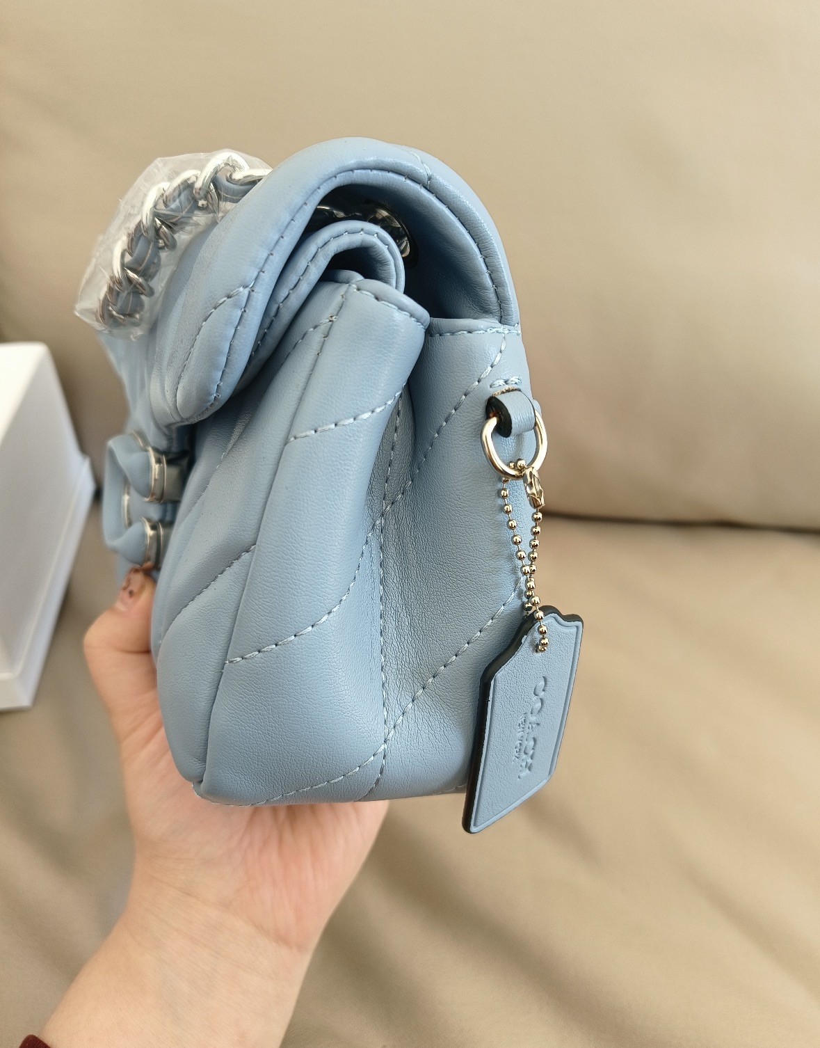 The COACH Tabby Shoulder Bag 26 in Quilted Light Blue is a stylish and versatile accessory for women. With its small size and sleek design, this shoulder bag is perfect for casual occasions. Made from nappa leather, it exudes luxury and sophistication. The blue exterior color adds a pop of color to any outfit, while the Coach brand ensures quality and style. This bag from the Coach Outlet collection is a must-have for fashion-forward women looking to add a touch of elegance to their ensemble.
