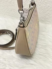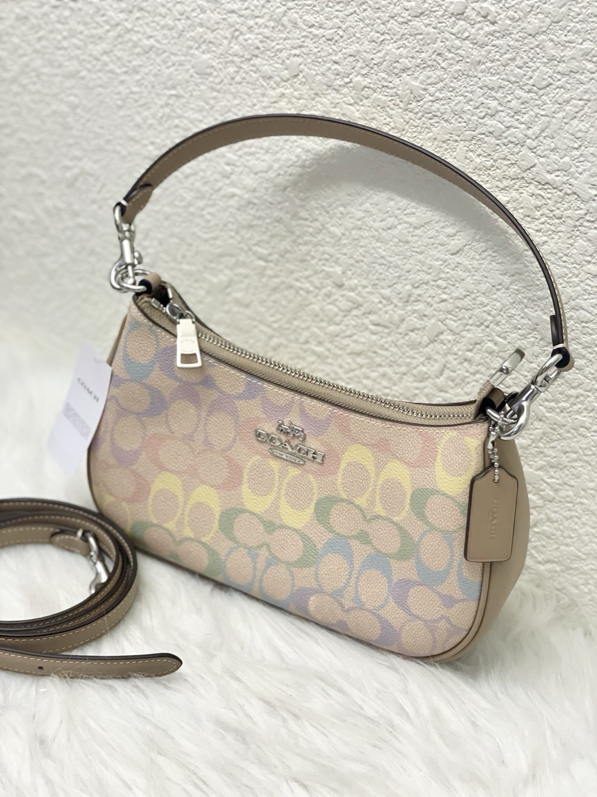 COACH Teri Shoulder Bag In Rainbow Signature Canvas & Leather CDA91 Silver/Sand 100% Authentic Important: because of the way this bag is made, the zipper will not close completely. See image 14. Product Details: Signature coated canvas and smooth leather Fabric lining Inside multifunction pocket Zip-top closure Detachable handle with 8.5" drop Detachable strap with 22.75" drop for shoulder or crossbody wear 9.5” (L) x 6.0" (H) x 3.0” (W) Style No. CDA91 This bag does not come with a Dust Bag. Price is firm