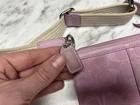 The COACH Vintage Y2K Swingpack Mini Signature Crossbody Bag in pink is a stylish and small shoulder bag perfect for travel, parties, or casual outings. This purse features a rectangular shape with a zip closure, ivory crossbody strap, and silver hardware accents with the signature Coach logo. The pink exterior canvas and lining, along with the outer pocket and bag charm, make this vintage Y2K satchel a trendy and classic accessory for women who appreciate designer fashion from the 90s. There is quite a bit of staining on the outside, inside and strap of this purse. Please see photos.