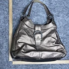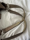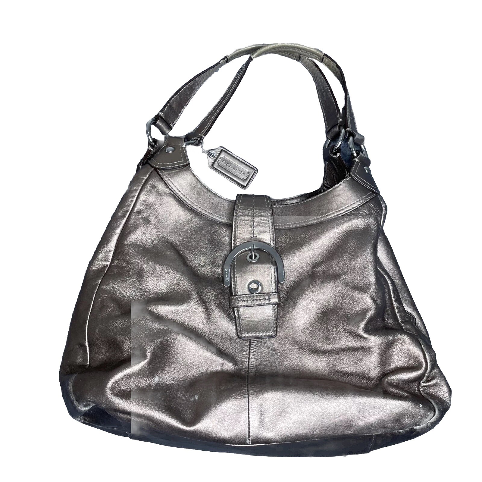 Get ready to make a statement with this COACH Metallic Gold Leather Double Top Handle Bag. Perfect for any occasion, whether it's a casual outing or a formal event, this satchel exudes sophistication and style. The luxurious leather exterior is accented with gold hardware and a chic buckle detail, while the spacious interior features pockets to keep your essentials organized. Complete with a magnetic and zip closure, this bag is both practical and fashionable, making it a must-have addition to your accessory collection. Wear to the corners and handles please see photos.