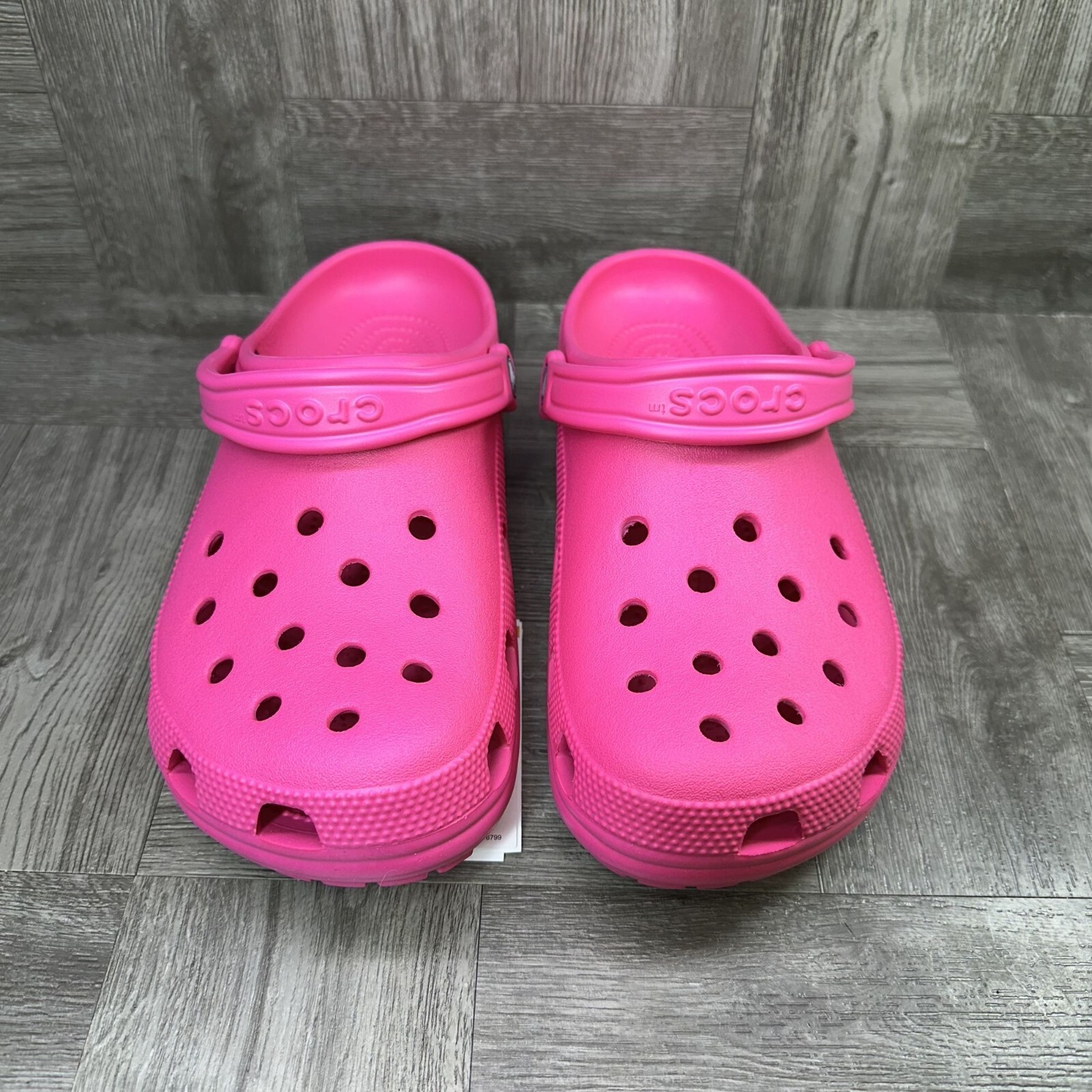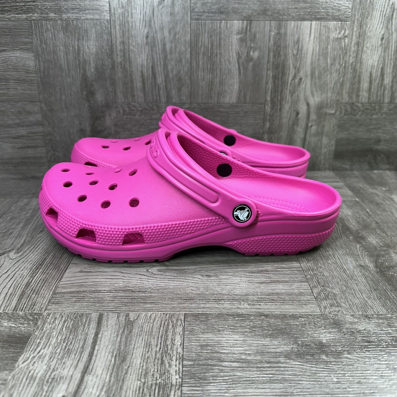 Step into effortless comfort with the CROCS Classic Women's size 11 sandals in a vibrant hot pink hue. These iconic slide sandals are designed with a lightweight and breathable construction, ensuring your feet stay cool and comfortable throughout the day. The durable rubber upper and insole material, paired with a foam cushion, offer a soft feel with every step. Perfect for a range of occasions, from casual outings to active travel, these sandals are adorned with beaded accents, glitter details, and the classic Crocs logo for a touch of style. The versatile design is suitable for fall, spring, and summer wear, making them a must-have addition to your footwear collection. Enjoy the freedom of a slip-on style with the reliable support of a flat heel.
