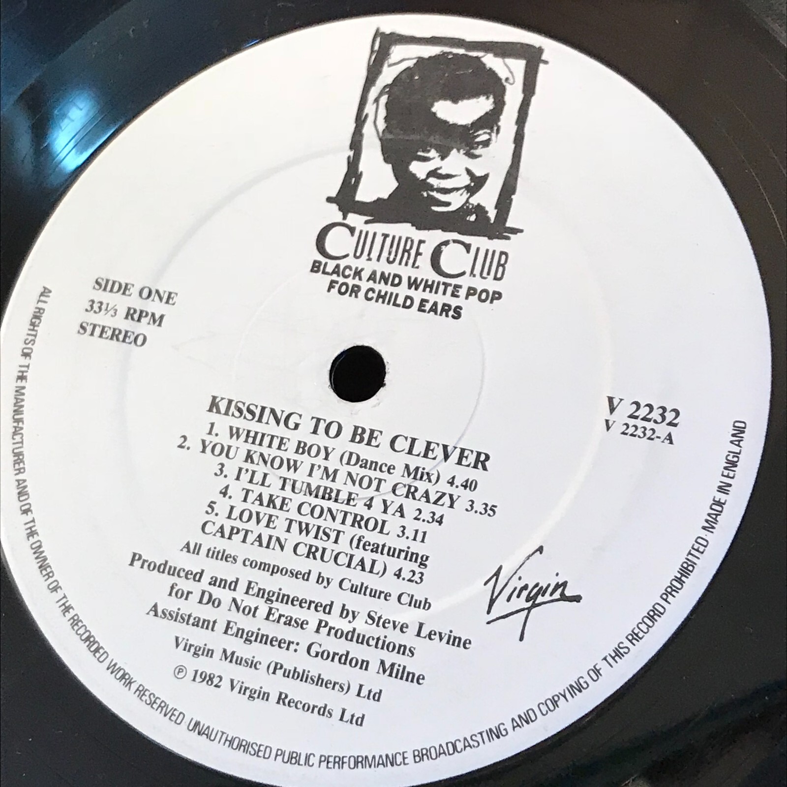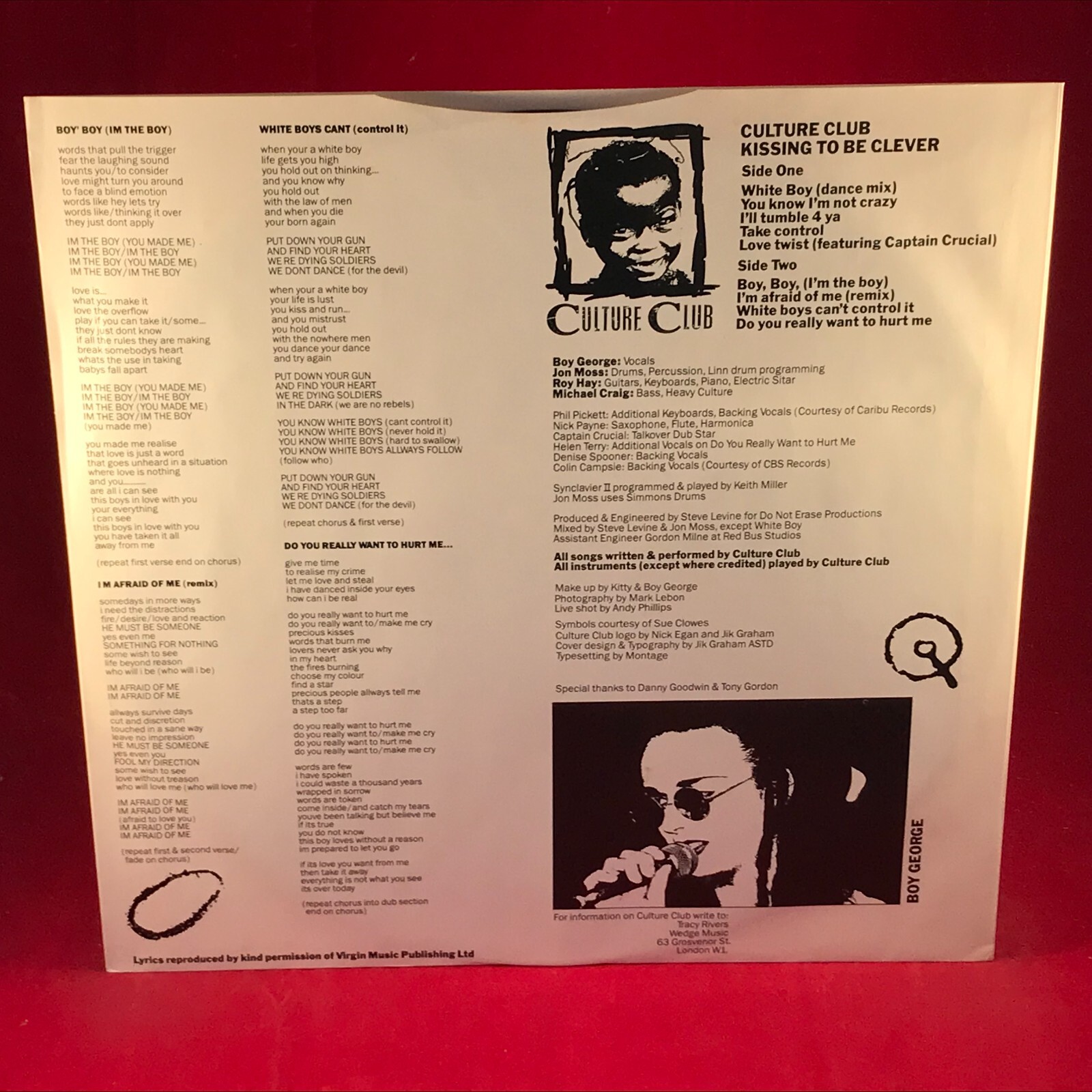CULTURE CLUB Kissing To Be Clever - 1982 UK vinyl LP, the debut album from Boy George & Co. including the massive hit 'Do You Really Want To Hurt Me'. Complete with the illustrated lyric inner. V2232 1. White Boy (Dance Mix) 2. You Know I'm Not Crazy 3. I'll Tumble 4 Ya 4. Take Control 5. Love Twist (Featuring Captain Crucial) 6. Boy Boy (I'm The Boy) 7. I'm Afraid Of Me (Remix) 8. White Boys Can't Control It 9. Do You Really Want To Hurt Me Record Condition : Excellent Sleeve : Minor shelfwear (see photo) Please check out our other items !