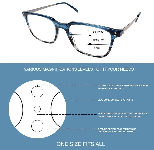 Multi-Focus Lens Blue Light Blocking Glasses with Custom Lenses of your power choice, precision cut by our on-site 30+ Year MASTER OPTICIAN. Multi-Focus Lenses provide both the ability to wear your glasses for Distance and Reading in one lens. Blue light blocking glasses may ease digital eye strain Excess device usage may lead to computer vision syndrome or digital eye strain. Glasses with blue light filtering technology may enhance your focus and reduce eye strain, resulting in making your eyes feel less tired and improving productivity. Another way to reduce eye strain is to make sure you take regular breaks from the screen. You may sleep better with blue-light blocking glasses One of the more surprising impacts of exposure to screens is the potential to negatively affect sleep patterns. Blue light has a high energy frequency that may increase alertness and delay the body's release of melatonin, which helps induce sleep. In general, we should all avoid using blue-light devices one to two hours before sleep. Blue-light blocking glasses may reduce the impact blue light, enabling you to use your devices before bed and still get a good night's sleep. However, the best option is to put the screen down before it's time for bed. May decrease your risk of macular degeneration, reduce glare, and increase the clarity of your vision. AMD is a leading cause of blindness. Blue-light blocking lenses may help avoid or delay this condition by preventing blue light from impacting your eyes. Excess device usage may lead to computer vision syndrome or digital eye strain. Glasses with blue light filtering technology may enhance your focus and reduce eye strain, resulting in making your eyes feel less tired and improving productivity. Another way to reduce eye strain is to make sure you take regular breaks from the screen. Soho Eyeglass Collection by Calabria Beautiful Acetate Frame Sleek Modern Designs Includes Case Dimensions (MM): 52-16-138 Listing and template services provided by inkFrog