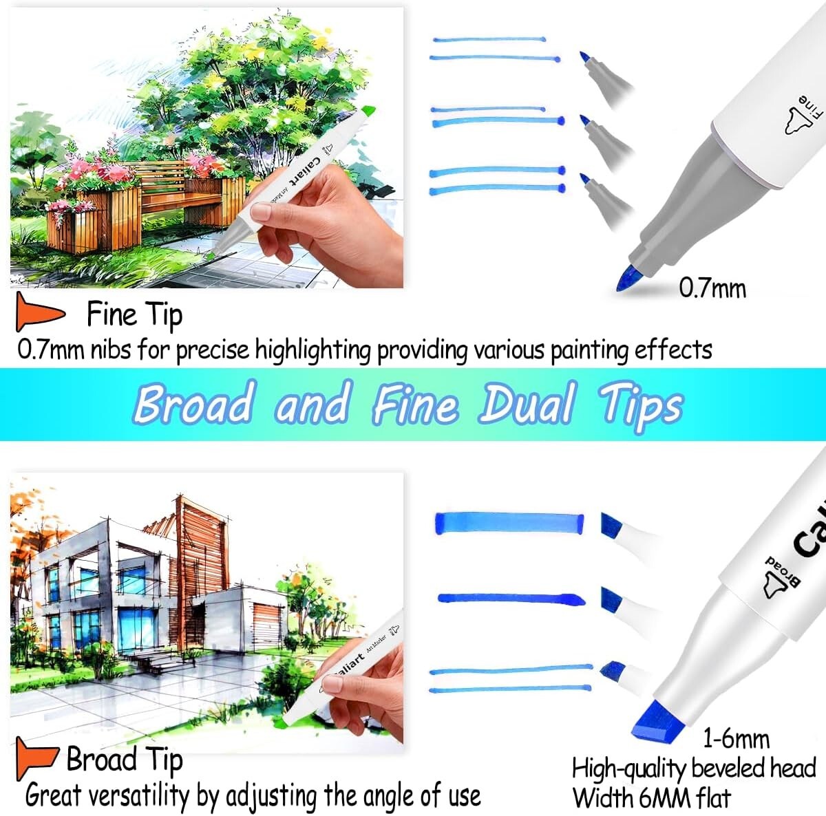 Caliart Markers, 100 Colors Dual Tip Art Markers Sketch Pens Permanent Alcohol Based, with Case for Adult Kids Halloween Drawing Sketching (White Barrel) 🎨 Alcohol Based & Permanent Markers with 100 Colors (99 colors and 1 colorless blender). Quality Alcohol-based ink. Excellent smudge-proof and waterproof qualities on most surfaces. Caliart Twin Tip Permanent Markers work well on paper, ceramics, plastic etc. Great as art markers, sketch markers, permanent markers, alcohol based markers, paint markers. 🎨 Dual Tips & Round Pen holder - Broad chisel (approx. 1-7mm) and fine point(approx. 0. 7mm) nibs for precise highlighting and underlining. Allowing you to write in both thin and thick lines, providing great versatility. Caliart artist markers are great for providing various styles, sketches and patterns with ease. NOTE: as they are Alcohol Based Markers like ALL other brand alcohol markers, they will Bleed through regular coloring paper, except very thick paper, marker paper. 🎨 COLOR-CODED CAPS & BONUS CASE: The color-coded caps allow for ease in organization and to identify colors quickly. Ergonomic design makes working with these markers easy for a long time. Equipped with a beautiful form-fitting black carrying case perfect for traveling and storing. 🎨 QUALITY ART MARKERS: The highly pigmented and vibrant markers are built to last without worrying about smudges, allowing you to color in at least 300 m worth of drawings and blend beautifully for added dimension to your artwork. The alcohol markers ideal for architectural design, advertising rendering, landscape, underlining, highlighting and other forms of comic design. Perfect gift idea for Christmas, Thanksgiving, school students, families, friends. Caliart Alcohol based markers pens: Caliart's quality alcohol markers maked the coloring world crazy and will your the soul of creation.you will love it! Feel totally free to contact us for a replacement if the original item has any defect.