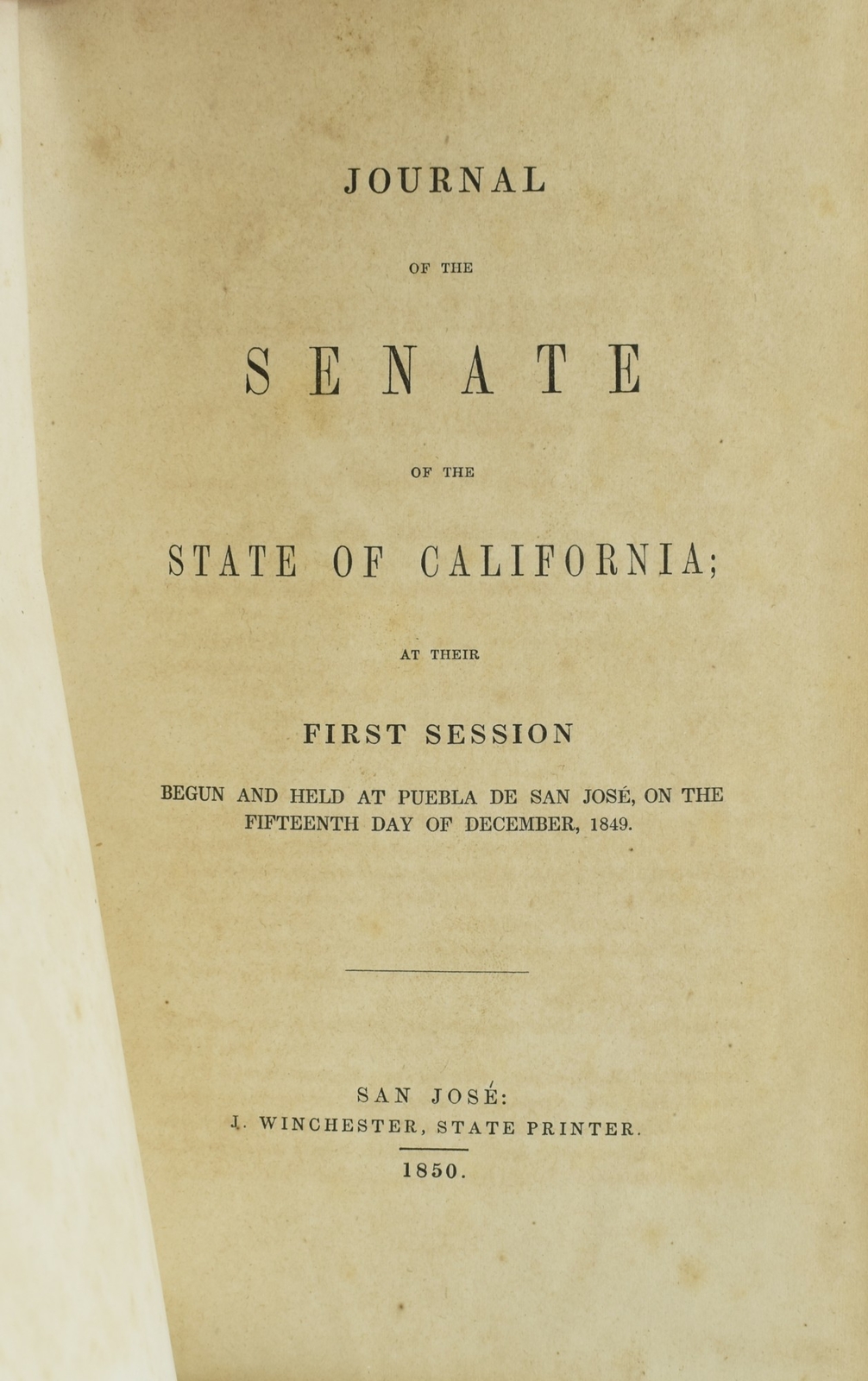JOURNAL OF THE SENATE OF THE STATE OF CALIFORNIA; AT THEIR FIRST SESSION. BEGUN AND HELD AT PUEBLA DE SAN JOSE, ON THE FIFTEENTH DAY OF DECEMBER, 1849 Title: JOURNAL OF THE SENATE OF THE STATE OF CALIFORNIA; AT THEIR FIRST SESSION. BEGUN AND HELD AT PUEBLA DE SAN JOSE, ON THE FIFTEENTH DAY OF DECEMBER, 1849 Publication: San Jose [New York]: J. Winchester, State Printer, 1850 Edition: First Edition Description: Half Leather. First Edition. First Edition of the Journal of the Senate of the State of California. The record of the first session of the newly incorporated State of California, 1850. Complete with two volumes in one. With all foundation laws for the new State, vote counts therefor, and reports on various subjects. According to Greenwood, the volume was printed in New York despite the San Jose imprint. Foxing to the endpapers only; some staining to the bottom edge of the textblock; writing on the California State Library bookplate, bleeding onto the opposite page, the front endpaper. Minor loss to the extremities of the spine and edges of the boards; front joint cracked but holding well; surface wear to the spine. Half leather, with red and black leather labels, over marbled paper boards. Very Good. 570, (571)-1347 pp. OCLC notes two institutional holdings. (Robert Greenwood. California Imprints 167n). Very Good binding. Seller ID: 287420 Subject: History & Military, Scholarly Black Swan Books Richmond VA We specialize in antiquarian books, classic literature, the Civil War, Viriginiana, travel, art, children's books, and other subject areas, including religion and philosophy . Terms Payment via PayPal is preferred. All orders ship within two [2] business days, Monday through Friday by standard mail, USPS Media Mail. Combined orders and expedited shipping is available. Please contact us for a shipping quote before ordering. All items are guaranteed as listed and described. Any item may be returned within 30 days for any reason in the condition is which they were sent. This listing was created by Bibliopolis.