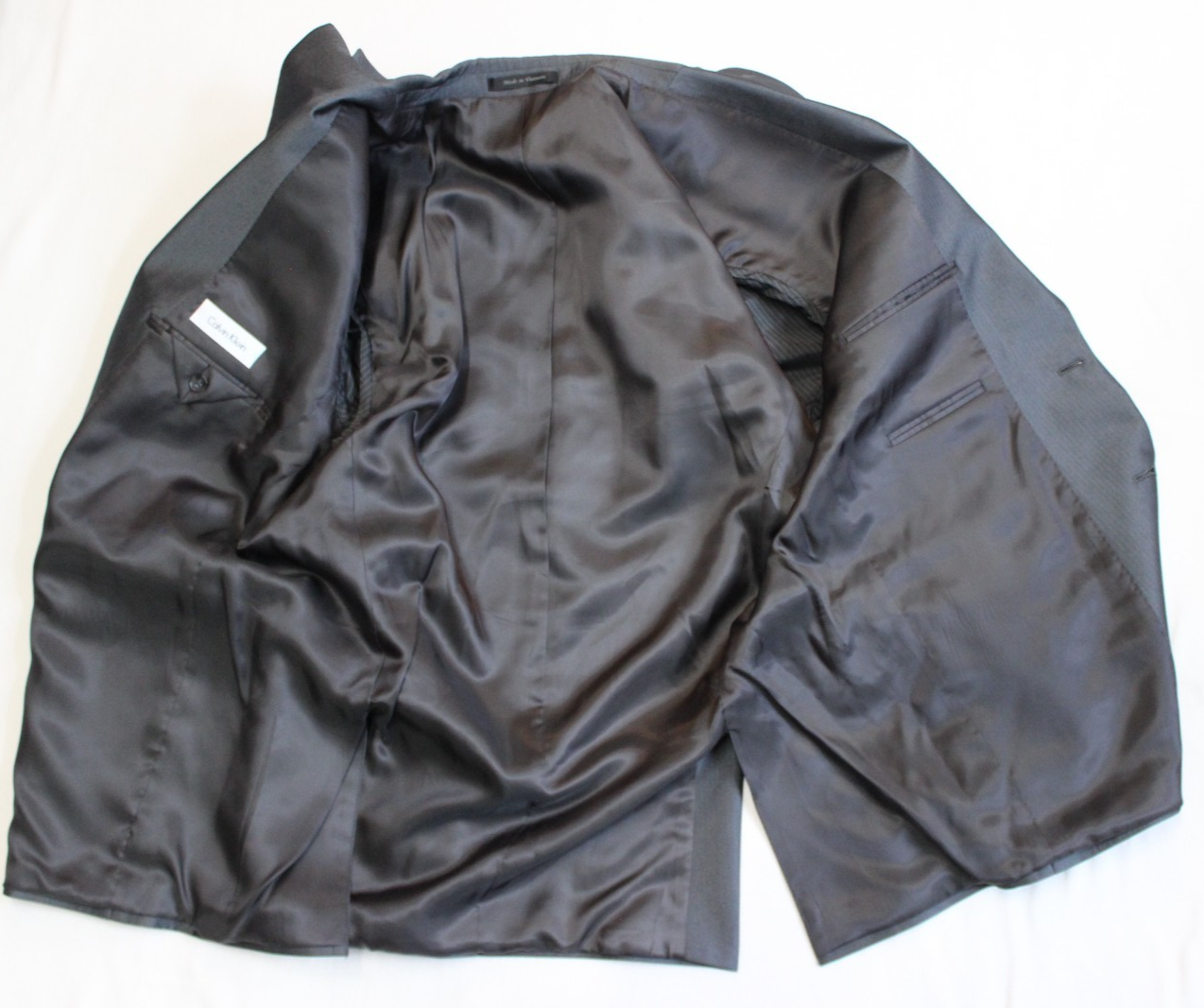 This Calvin Klein Men's Size 44L Gray Sport Coat Blazer Jacket in Herringbone is a stylish and versatile addition to any man's wardrobe. The two-button front, notch lapel, and double-vented back give it a classic and sophisticated look, perfect for formal events, business meetings, or even a night out. Made from wool with a polyester lining, this jacket is designed for comfort and durability. The intricate herringbone pattern adds a touch of texture and interest, making it a standout piece for the fashion-conscious man.