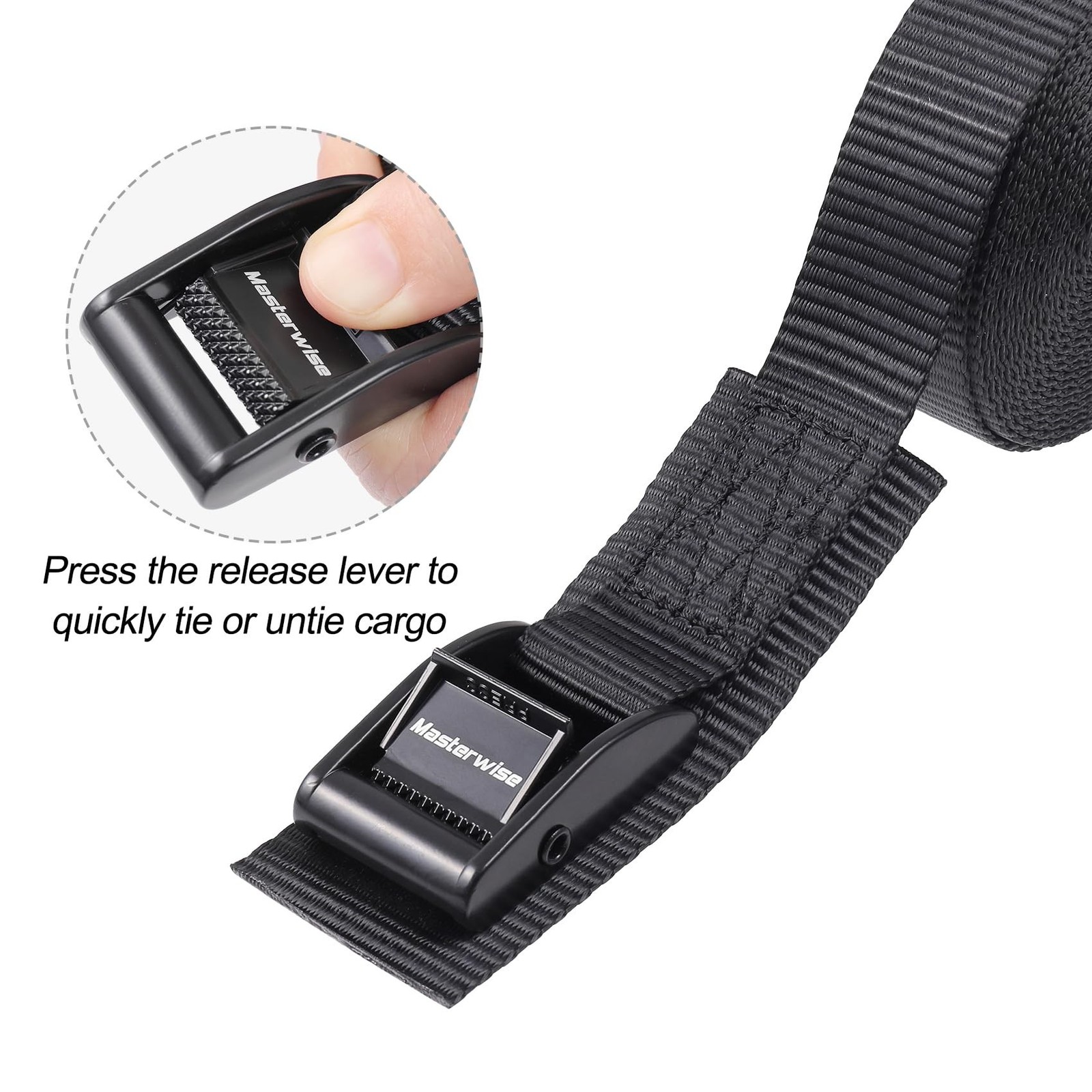 Cam Buckle Tie Down Straps, 1" x 12' Adjustable Pull Straps with Cam Buckle, Heavy Duty Cam Straps for Kayak, SUP, Cargo, Bicycles, Motorcycle, Truck, Car Roof Rack, Dirt Bike (4 pcs) Product Details Size: 1“x12‘ Number of Items: 4 Brand: Masterwise MPN: MW-ZincStrap UPC: Does not apply EAN: Does not apply Size: 1“x12‘ Material: Nylon Color: Black Brand: Masterwise Vehicle Service Type: Passenger Car, Bikes, ATV, Van, Scooter, Boats, UTV, Truck, Trailer Size: 1“x12‘ Material: Nylon Color: Black Brand: Masterwise Vehicle Service Type: Passenger Car, Bikes, ATV, Van, Scooter, Boats, UTV, Truck, Trailer Load Capacity: 2200 pound Fastener Material: Zinc Fastener Type: Buckle Tensile Strength: 2.2E+3 Pounds Number of Pieces: 4 Product Dimensions: 144"L x 1"W Manufacturer: Masterwise Unit Count: 4.0 Count Model: MW-ZincStrap Item Weight: 1.61 pounds Item model number: MW-ZincStrap Manufacturer Part Number: MW-ZincStrap Date First Available: June 12, 2024 Sturdy Cam Buckle: These tie down straps are made of sturdy zinc alloy cam buckle and strong anti-corrosive nylon webbing. Breaking strength of our tie downs is 2200lbs. Easy to Use: Adjustable buckle straps make it quick and easy to tie down or untie your small cargo. Simply press the release lever and the cam buckle have strong grip to hold your cargo tightly in place. Additional Protection Pad: Nylon webbing safety pad under the cam buckle protect your vehicle and cargo from scratches during transportation. Size Measurement: 1x12 motorcycle tie downs. 4pcs motorcycle straps per pack. Wide Application: These cam buckle straps are perfect for moving and securing your motorcycles, dirt bikes, trucks, ATVs, motocross bikes, etc. for extra protection on your ride.